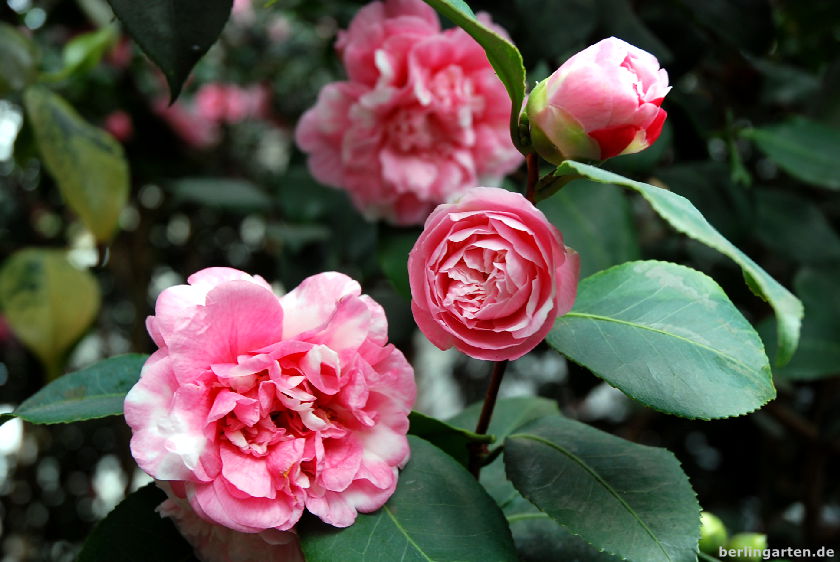- Interessantes Farbspiel: Kamelie Camellia japonica im Botanischen Garten Berlin