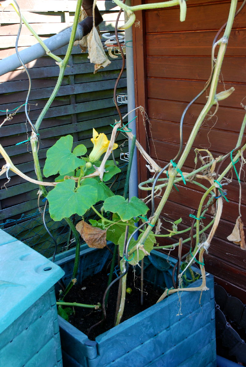 Dann heißt es über die Saison nur noch: reichlich gießen. Und die Triebe Richtung Dach lenken. Da wirst du eine Menge zu tun haben, denn der Kürbis wächst munter, bekommt Sonne und hat wenig zu befürchten. Schnecken hast du hier oben nämlich viel weniger, als in den tieferen Etagen.