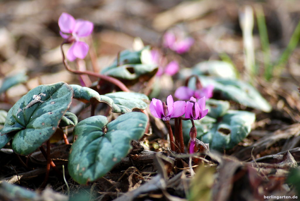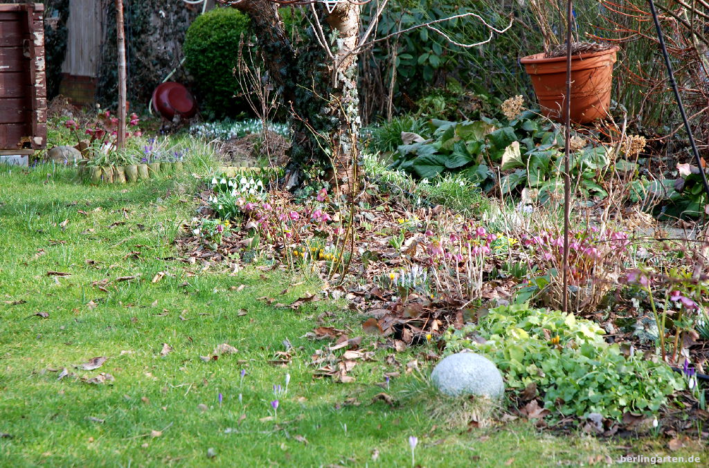 Seit dem letzten Blick kann ich auch einige Neulinge begrüßen: das Winteralpenveilchen Cyclamen coum, Puschkinien, Iris sowie neue, kräftig gefärbte Krokusse. Bei den Stauden präsentieren sich die Lenzrosen von ihrer besten Seite und auch die Primeln blühen inzwischen üppig.