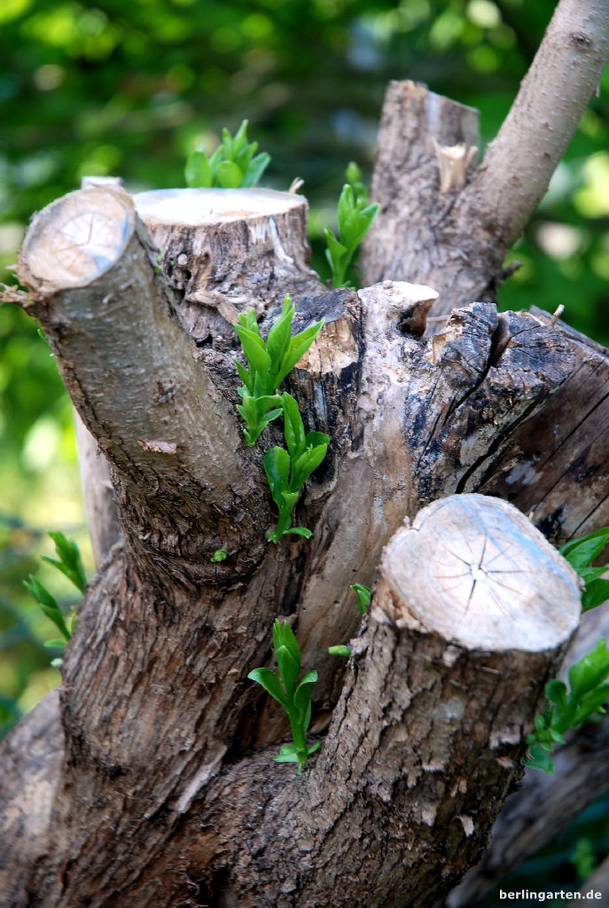 - Der radikal gestutzte Flieder schlägt wieder aus