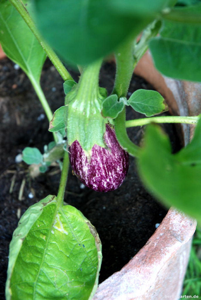 In Topfkultur ziehen wir Tomaten und Auberginen. Dieses Jahr versuchen wir es bei Ersterer mit der bis zu 1,20 m hoch werdenden ‚Sweet Million‘ und der nur 40 cm klein bleibenden ‚Heartbreakers Vita‘. Eine normale für den Freilandanbau ist die ‚Koemser Perle‘, die mir Foodbloggerin Nicole von Lokalverstärung geschenkt hat. Die lila-weiß gestreifte Aubergine ‚Antigua‘ hat schon eine ansehnliche Frucht ausgebildet. Der Gartengemahl, der bei uns der Chef über das Gemüse ist, freut sich sehr darüber und schaut täglich mit Argusaugen, dass sich da bloß keine Schnecke gütlich tut.