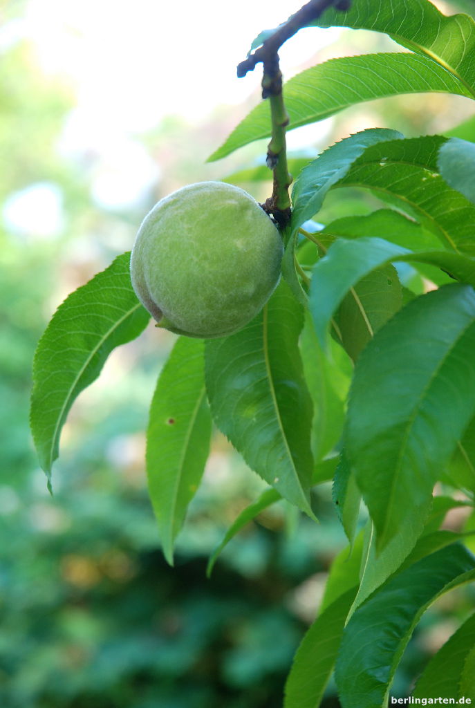 An Obst reifen darüber hinaus Johannis-, Blau- und Stachelbeeren sowie die Sauerkirsche ‚Schattenmorelle. Zum Glück zeigt sie dieses Jahr noch keine Anzeichen der gefürchteten Monilia Spitzendürre. Auch der Pfirsichbaum ‚Kernechter vom Vorgebirge‘ ist noch gesund.