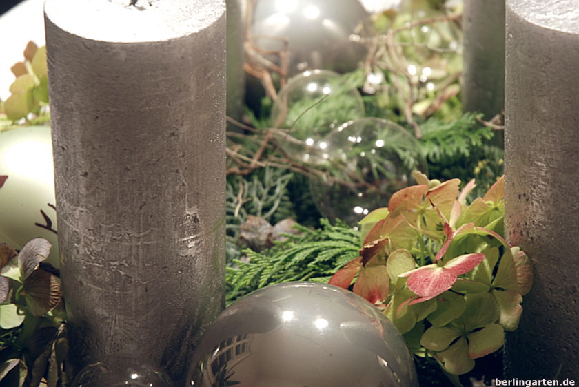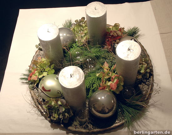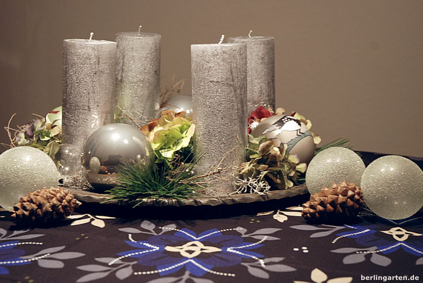 In diesem Jahr ist alles Trend, was eher nach Natur, als nach Weihnachten aussieht. Das kommt mir natürlich sehr gelegen, da ich so meinen Hortensien noch einen würdigen Auftritt verschaffen kann. Mit ihnen, ein paar Zweigen sowie ein bisschen Kiefer ist schon alles komplett. In die Mitte lege ich einen kleinen Kranz, den ich neulich mal gekauft hatte und an die Tür hängen wollte. Zwei meiner Vogel-Kugeln dazu, für den Glanz noch etwas in silber und Glas – meine Adventsdeko im vegetabilen Look ist fertig.