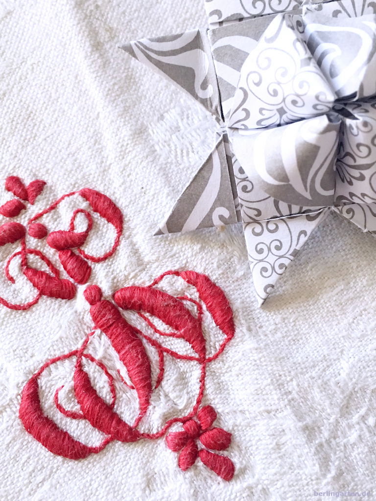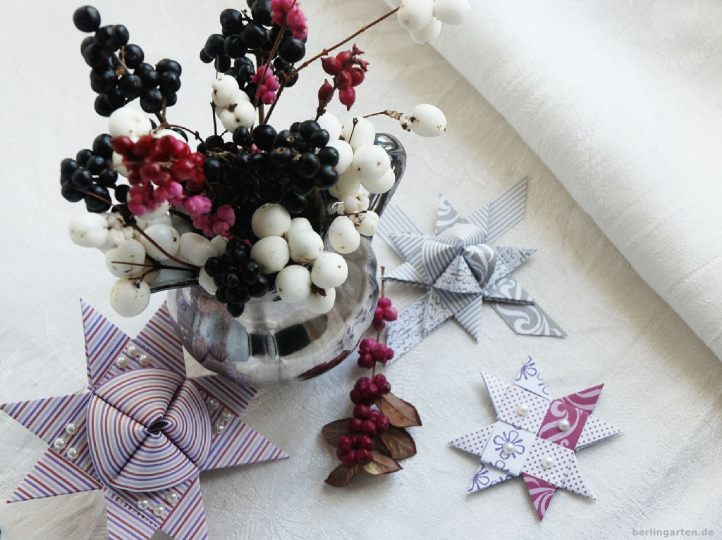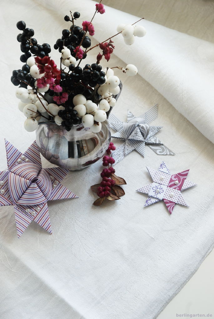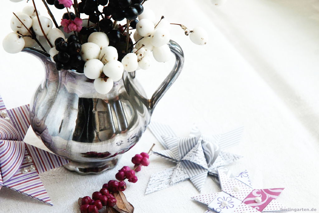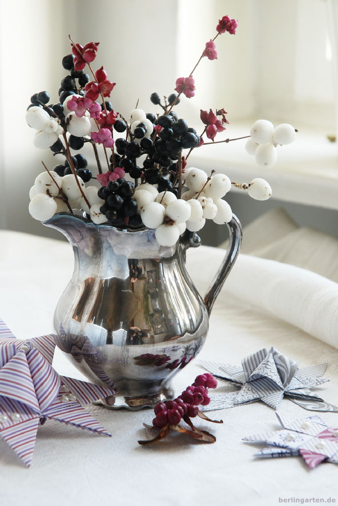 Was im Park noch ziemlich nach sparrigen Allerweltsgewächsen aussieht, verwandelt sich in einer kleinen hübschen Silberkanne zu einem stilvollen Hingucker, was meinst du? Kurzgeschnitten und die Beeren eng zusammengefasst gefallen sie mir richtig gut. Arrangiert auf altem Familienleinen und mit nagelneuen, von der Tochter gefalteten Advents-Papiersternen ist rasch eine Adventsdeko zusammengestellt, die anders daherkommt als klassisch mit Tanne oder Kiefer.