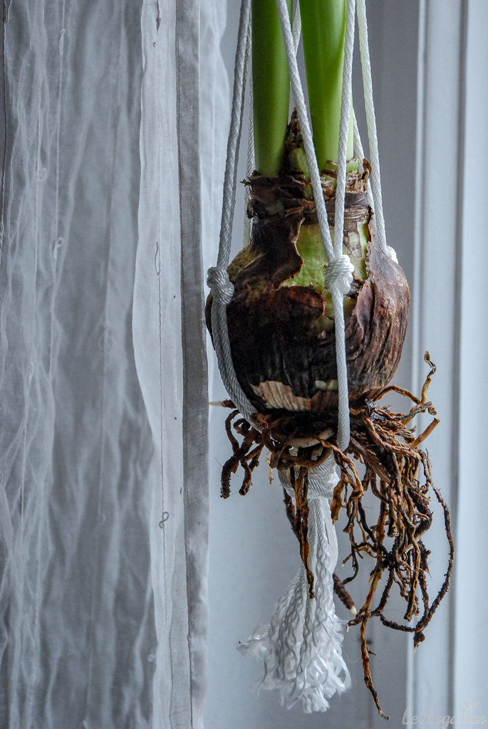 A pro pos Schwung: Wie wäre es mit einer Amaryllis am Fenster? In einem hübschen Makramee-Netz baumelnd hat sie viel besseren Halt als in so manchem Gefäß, in dem ihre Stiele sich nicht so gemütlich anlehnen können.
