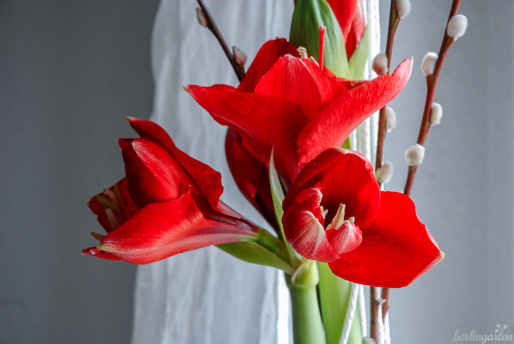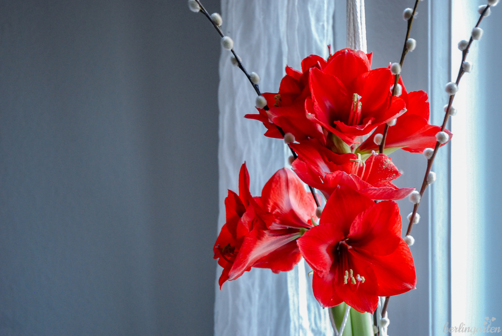 Ich habe dieses klassisch-schöne rote Exemplar von der Erde befreit und mit ein paar Weidenkätzchenzweigen in eine Ampel gesteckt, in der ich im Sommer meine Kräuter auf dem Balkon kultiviere. Wie du diese ganz leicht herstellen kannst, habe ich hier schon einmal beschrieben.