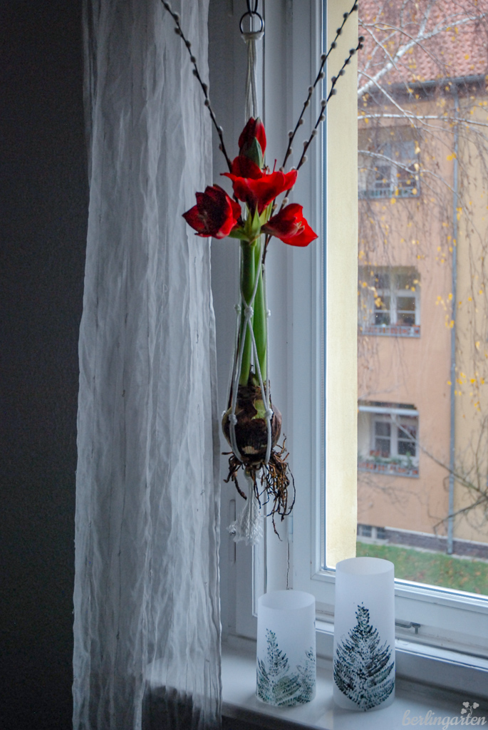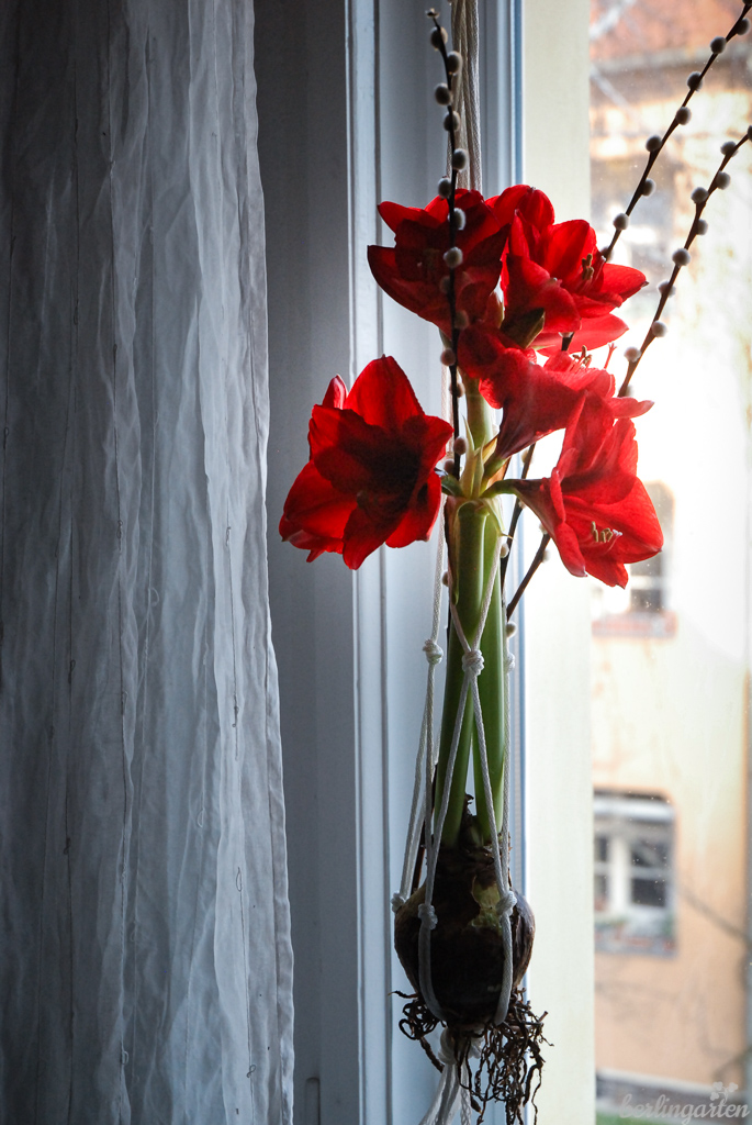 Amaryllis-Ampel am Fenster: eine Blume in Schwung