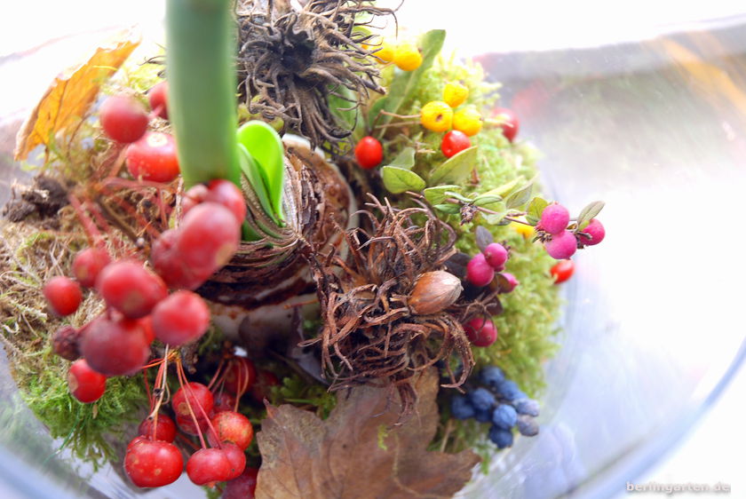 Dann bin ich nämlich frei, sie einzusetzen, hinzulegen, aufzustellen, wie ich mag. Wie hier im Bild mit Beeren und Moos (zur besseren Luftzirkulation auf Steine), aber zum Beispiel auch nur mit nackten, knorrigen Ästen. Dann sieht man auch die ja eigentlich hübsche Zwiebel gut. Meine favorisierten Gefäße sind dementsprechend hohe aus Glas. Die sorgen auch noch für den nötigen Halt, wenn die schweren Blüten aufgehen.
