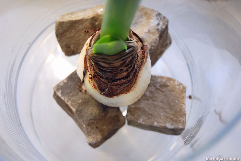 Ich mag bereits vorgetriebene Zwiebeln, da dann mit ihnen wirklich nichts schiefgehen kann. Sie brauchen – fast – kein Wasser mehr (normales Gießen würde nur zum verstärkten Wachstum der Blätter anregen), sodass ich sie stets von der Erde befreie und später nur alle paar Tage mit Wasser beträufel.