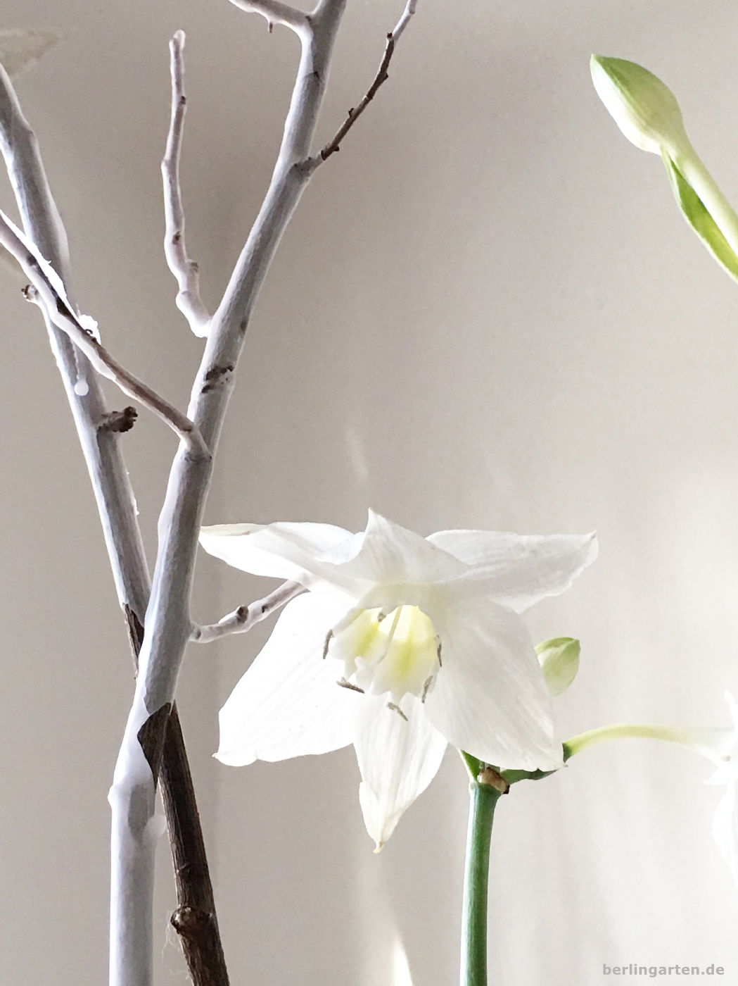 Ein Strauß so frostig wie der Januar – mit Eucharis, die auch Herzenskelch oder Amazonaslilie genannt wird, und mit Wachs geweißten Zweigen.