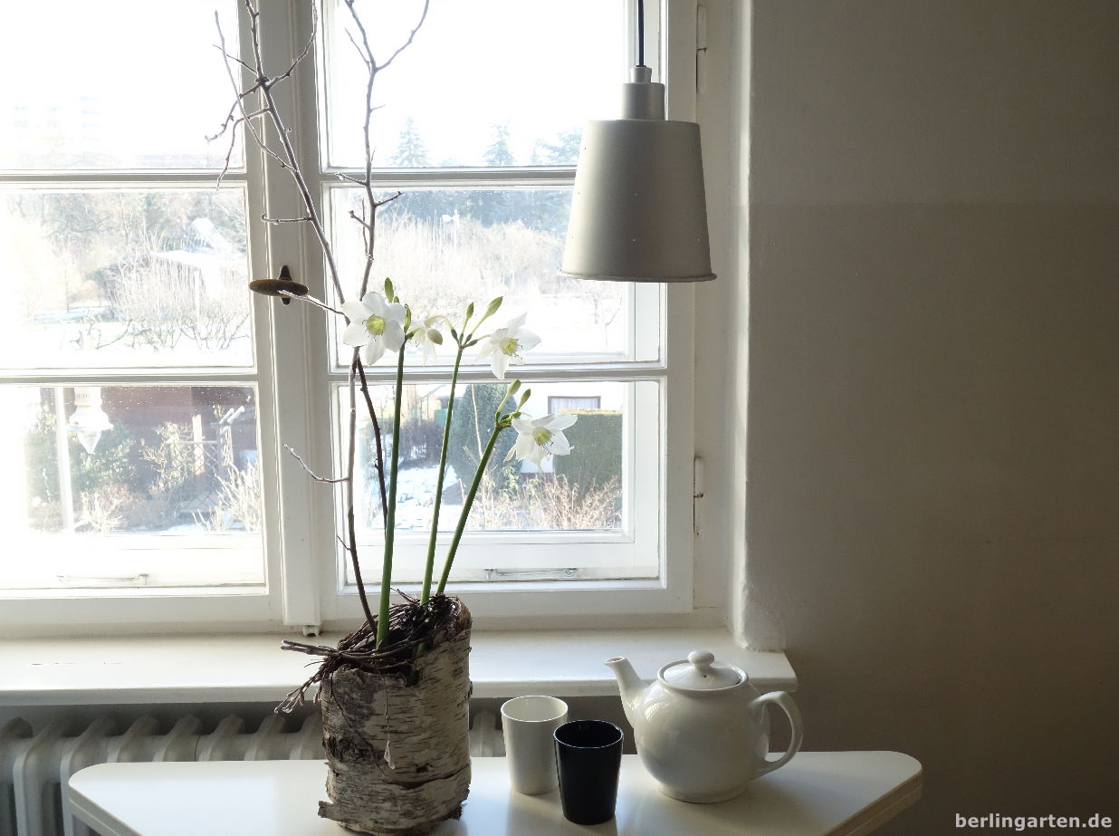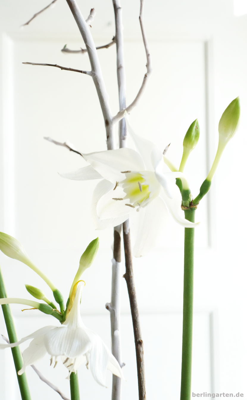 Beginnt das Jahr, eisig zu werden, die Natur, sich ganz in weiß zu zeigen, fange ich an, nach Eucharis Ausschau zu halten. Bis ich sie jetzt im Blumengeschäft bekam, hatte ich bestimmt schon zehn Mal nach ihr gefragt. Denn obwohl dieses elegante Amaryllisgewächs aus dem warm-feuchten Regenwald Perus kommt (nicht vom Amazonas, wie der Name vermuten lassen würde), ist sie für mich mit den hellen Farben des Januar/Februars verknüpft: kaltweiß mit einem leicht gelblichen Funkeln wie die langsam intensiver werdende Sonne. Du merkst: Für mich heißt sie Herzenskelch.