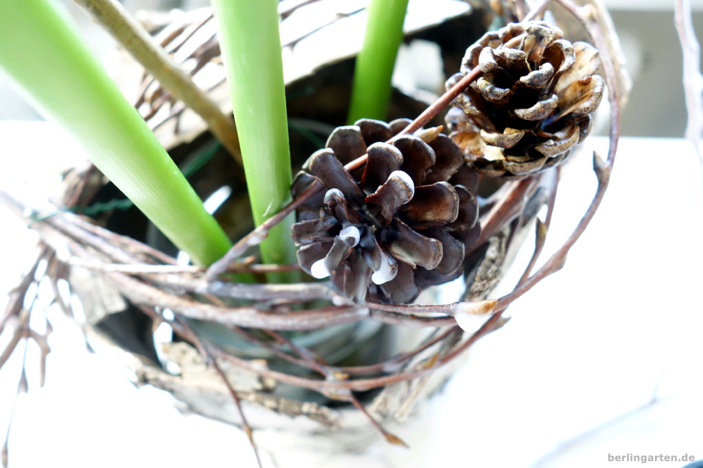 Mit dem Ikebana-Steckigel (Kenzan) arbeite ich inzwischen fast immer. Mit ihm ist es ein Kinderspiel, die einzelnen Zweige zu fixieren. Das zum Rund gedrehte Birkenbündel tut sein Übriges und sorgt für zusätzliche Standfestigkeit.