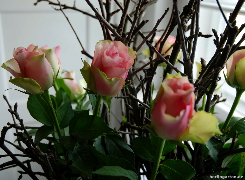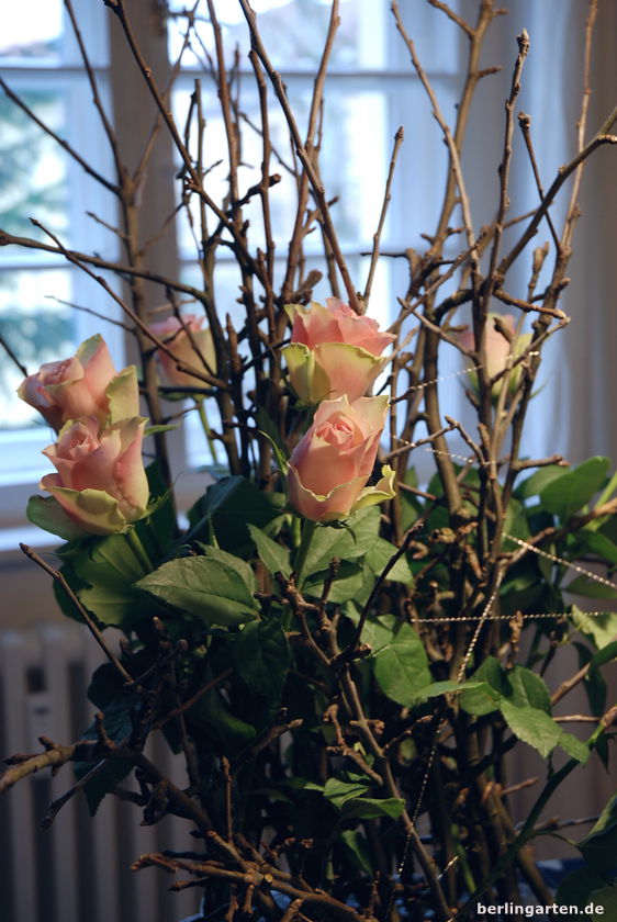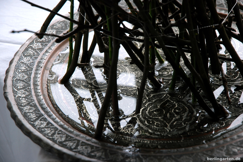 Dazu bündele ich die Apfelzweige, es müssen richtig viele sein, umwickle sie mit Silberdraht, nach unten schön gleichmäßig, damit der Strauß am Ende solide steht. Dazwischen kommen rosa Rosen. Warum Rosen? Als Gehölze sind deren Stiele angenehm fest. Der Nachteil: ihr Durst. Wenn du eine nur recht flache Schale so wie ich hast, musst du daher täglich den Wasserstand kontrollieren. Aber das macht ja Spaß. Oder?