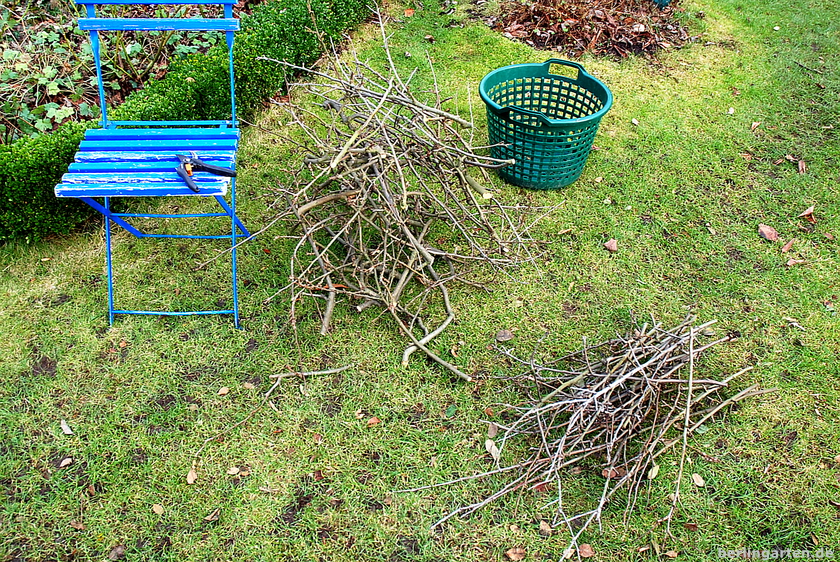 Und während der Berlingärtner mit prüfendem Blick die Schere führt, wuselt das Kind ihm und der Leiter zu Füßen herum und sortiert das herabfallende Material. Was eine schöne Länge hat, gerade gewachsen ist, aber mit kurzen Seitentrieben, kommt ins Körbchen für zu Hause, der Rest teilweise auf den Totholzhaufen, teilweise in den Hächsler. Die ganz langen, prächtigen Äste bleiben im Garten. Aus ihnen lässt sich sicher im Laufe des Jahres noch Schönes zaubern.