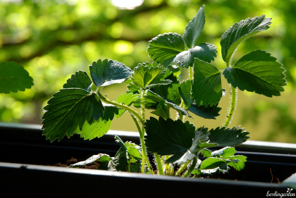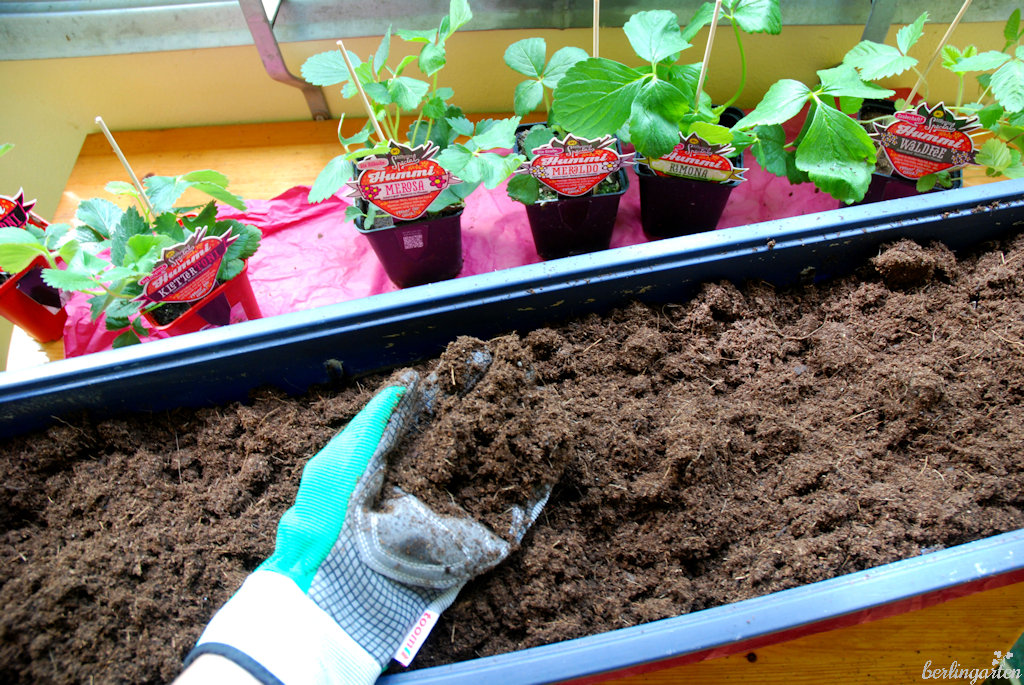 Hier mögen es die Erdbeeren nicht so üppig. Gut eignet sich Kräuter- und Aussaaterde, bitte keine vorgedüngte normale Pflanzerde verwenden.