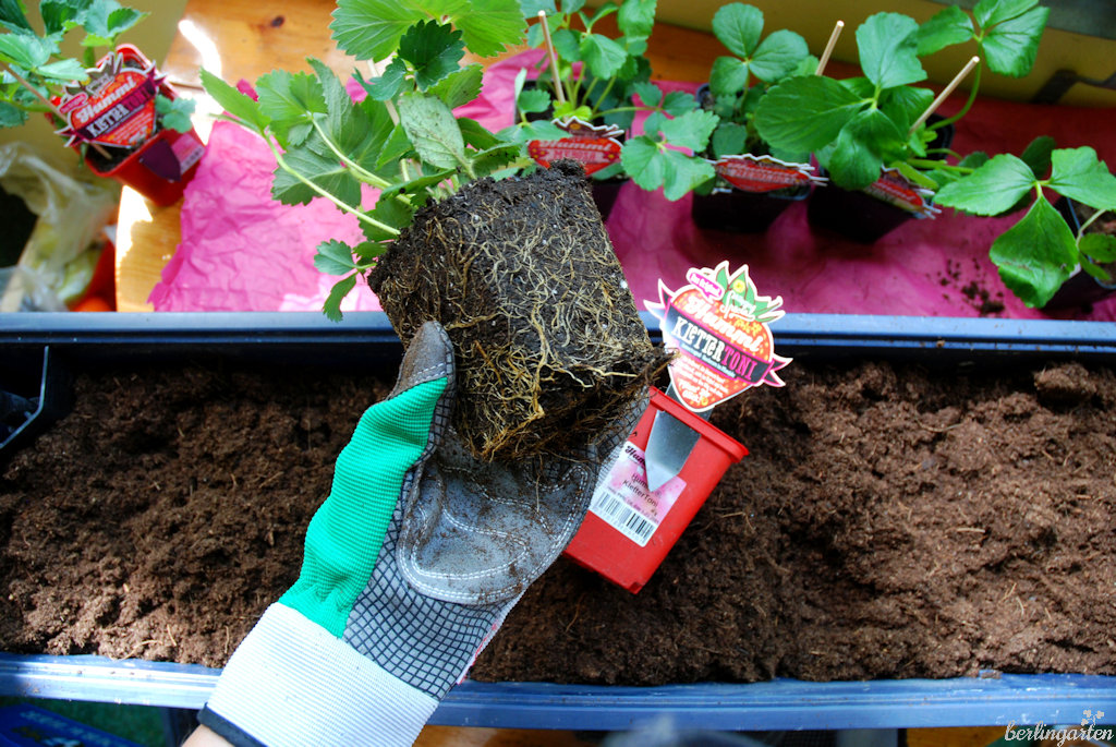 Die Pflanzung von Erdbeeren in Kasten oder Topf ist denkbar einfach, siehe auch die Fotos weiter unten: