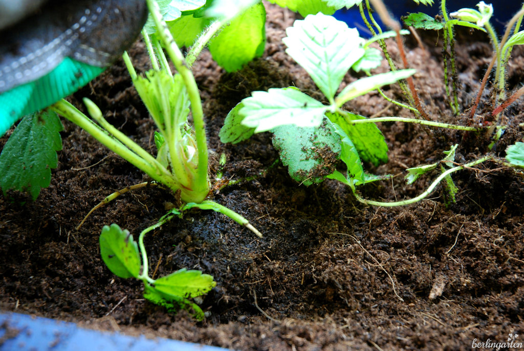 - Erdbeeren einpflanzen in wenig gedüngtes, strukturstabiles Substrat