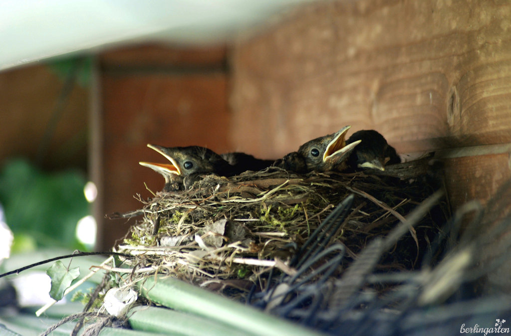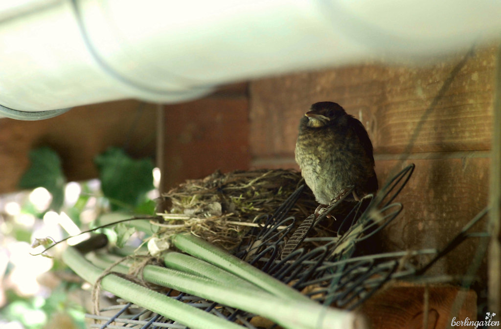 Am angesagtesten ist aber seit Jahr und Tag die Bambusstocksammlung an der Laubenseite, auf der Herr und Frau Amsel jedes Jahr zu brüten belieben. Dort ist es durch die Ansammlung von Flieder, Magnolie und Bauernjasmin geschützt und heimelig und gerade sind vier Junge von ihren wirklich fleißigen Eltern in die weite Welt hinausgeschickt worden. Ich kann dir sagen: So eine liebevolle Mutter und einen engagierten und beschützenden Vater könnte sich jedes Menschenbaby nur wünschen.