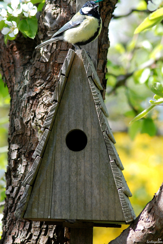 - Kohlmeise mit ihrem (früheren) Quartier. Hier nisten jetzt Gartenrotschwänze, da oben das letzte Hölzchen abgefallen ist und Licht hineinkommt