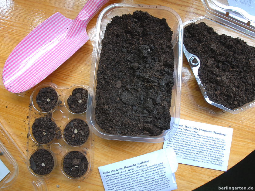 Und jetzt die Russische Stockrose Alcea rugosa in zartem Gelb dazu: klingt verlockend. Stockrosen sind für mich der Inbegriff fröhlicher Sommergärten und mit Kindheitserinnerungen an alte Bauernhäuser verbunden. Sie würden gut in den Hintergrund meiner gelb-violetten Rabatte passen und helfen, das Brodeln der Stadt rund um unsere Kleingartenanlage gedanklich auszublenden. Außerdem habe ich viele von diesen Plastikbehältnissen mit Deckel aufbewahrt, in denen Tomaten, Erd- und Blaubeeren oder Weintrauben angeboten werden. Als Miniaturgewächshäuser taugen sie prima.