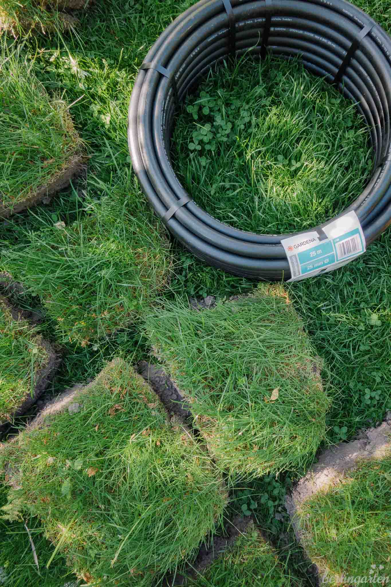 - Für die breiteren Kanäle mussten wir die Rasensoden breiter abstechen. Hier siehst du das Verlegerohr noch gerollt