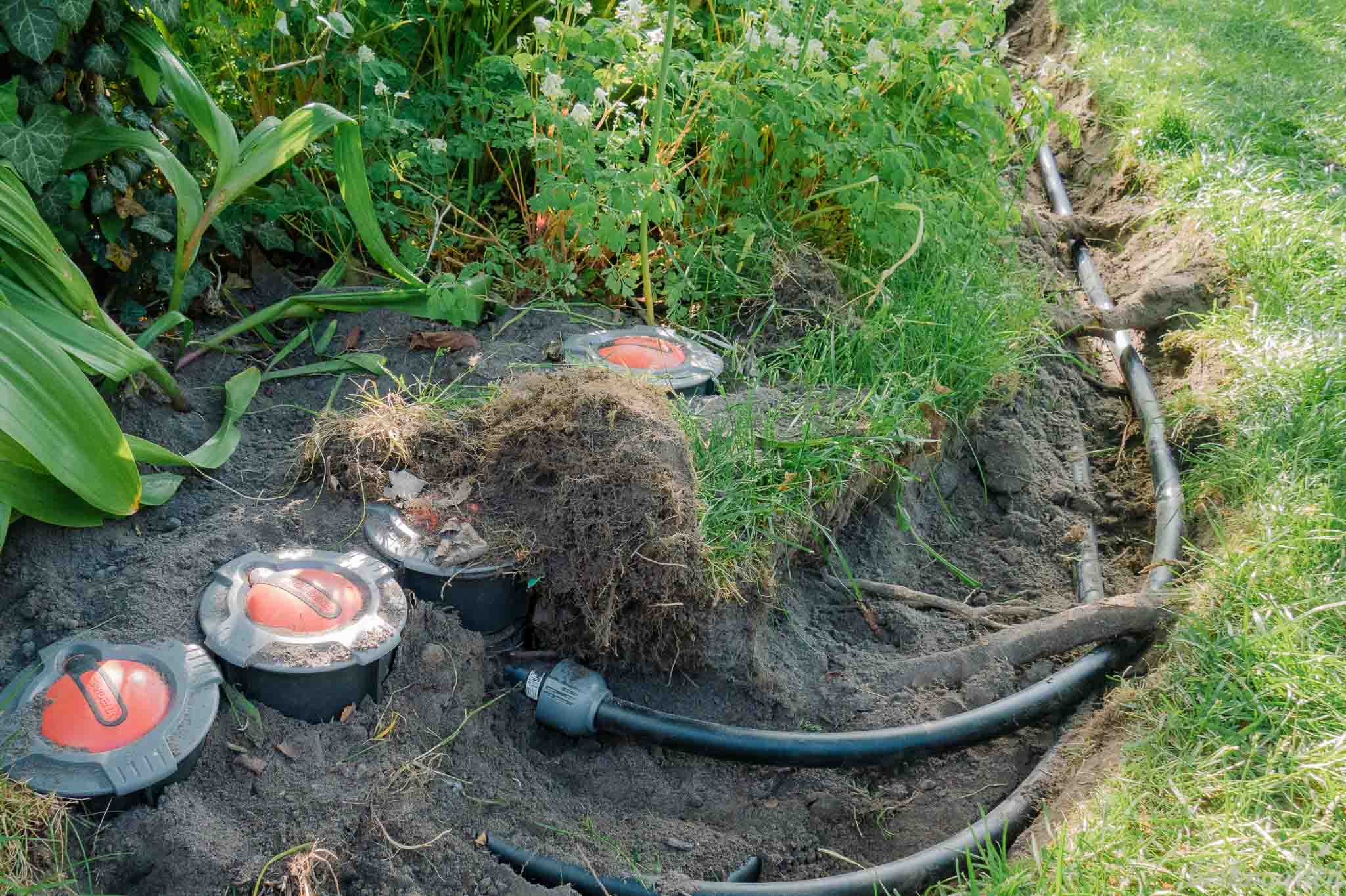 - Ein Zwischenstand: Alle Leitungen gehen von den Anschlussddosen ab, die Verlegerohre gehen bis zum linken Regner und zum Abzweig nach rechts