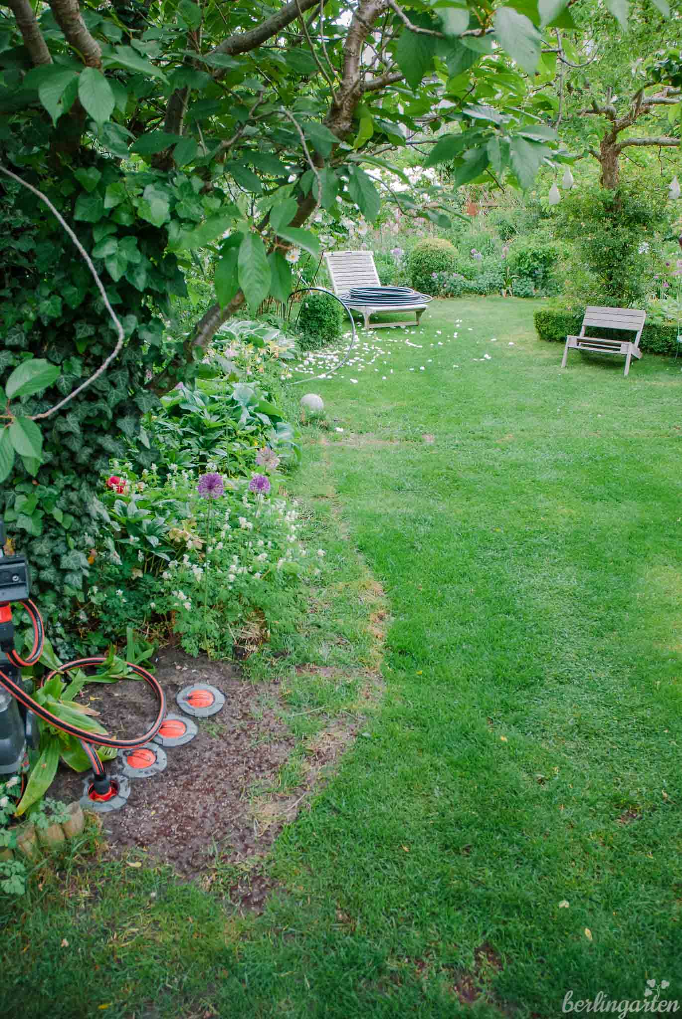 natürlich darfst du! Wir haben insgesamt einen Monat lang gebraucht und in vielen kleinen Etappen gearbeitet. Urlaub haben wir uns nämlich nicht genommen und wollten auch rückenschonend arbeiten. Für die Verlegung des Systems im Rasen muss ich sagen, dass ich da meinen Mann und seine Kraft brauchte, da ich es durch unseren sehr verdichteten Rasenboden nicht geschafft hätte, die Kanäle zu legen. Die unterirdische Verlegung im Beet – und die oberirdische sowieso – konnte aber auch ich gut erledigen.