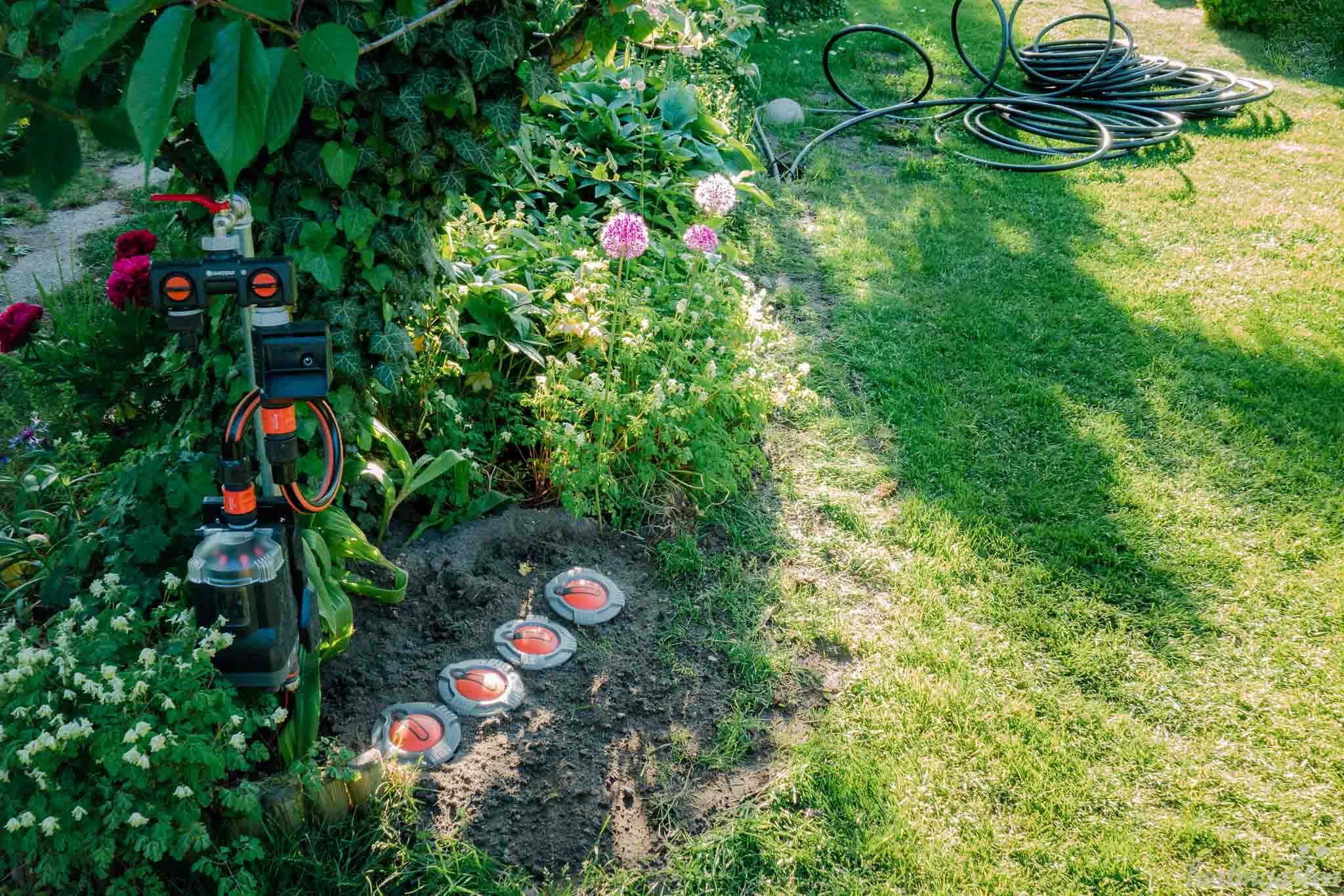 Wie schön, dass diese Vorstellung für uns kein Märchen mehr ist. Wir haben inzwischen den gesamten Garten an eine automatische GARDENA-Bewässerungsanlage angeschlossen: sowohl die Beete mit einer Tröpfchenbewässerung als auch den Rasen mit einer Sprinkleranlage. Wie wir letztere verlegt haben, möchte ich dir heute vorstellen.