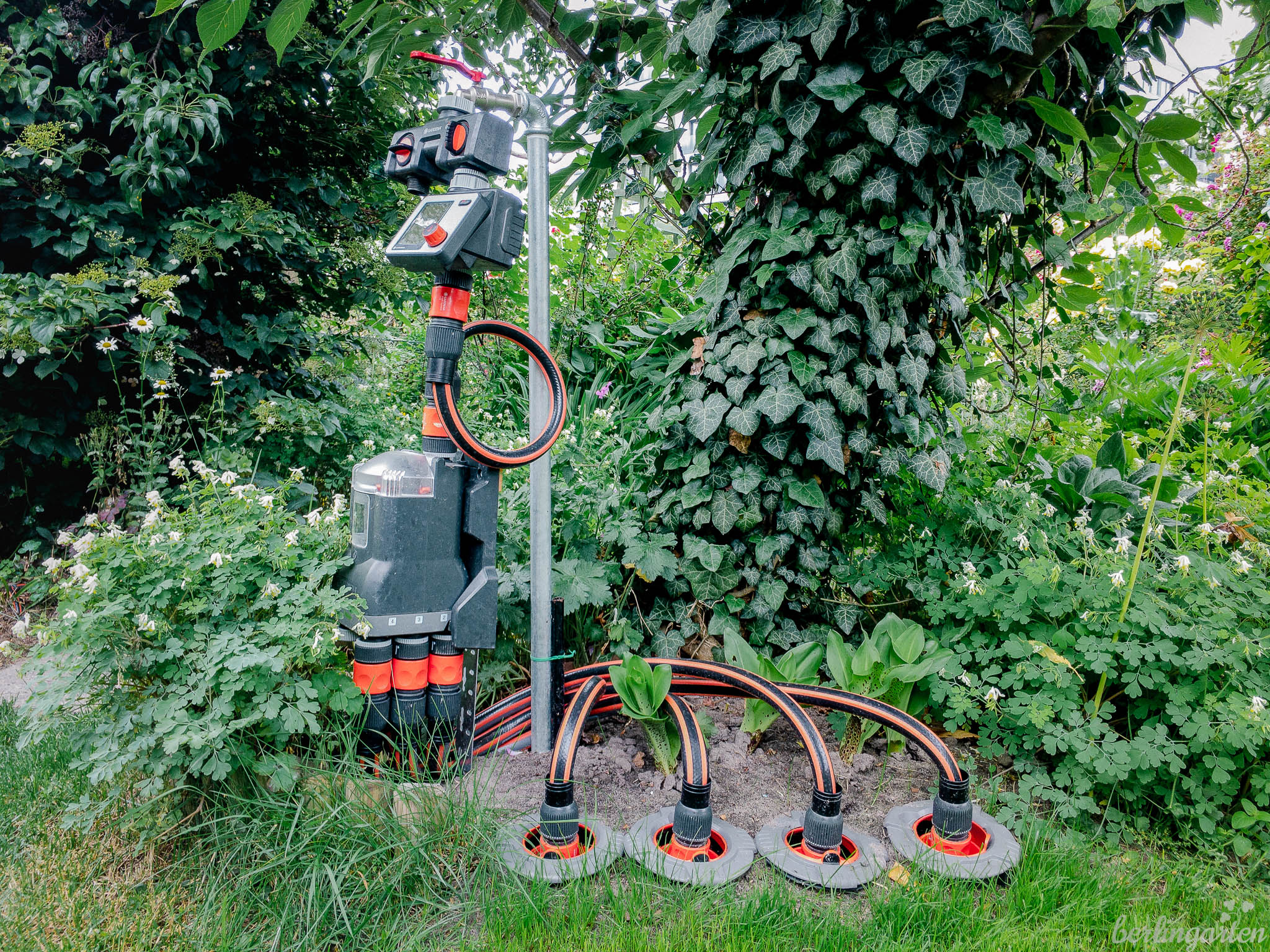 - Hier sind alle wichtigen Beteiligten für die automatische Rasenbewässerung: Master, Wasserverteiler, Anschlussgarnitur, Anschlussdosen