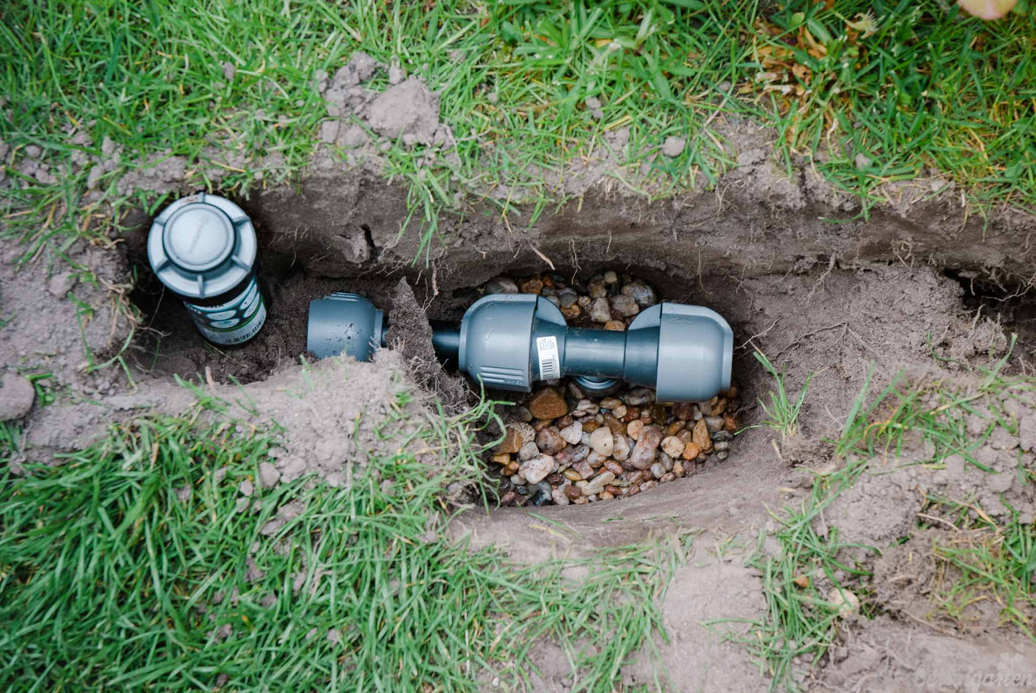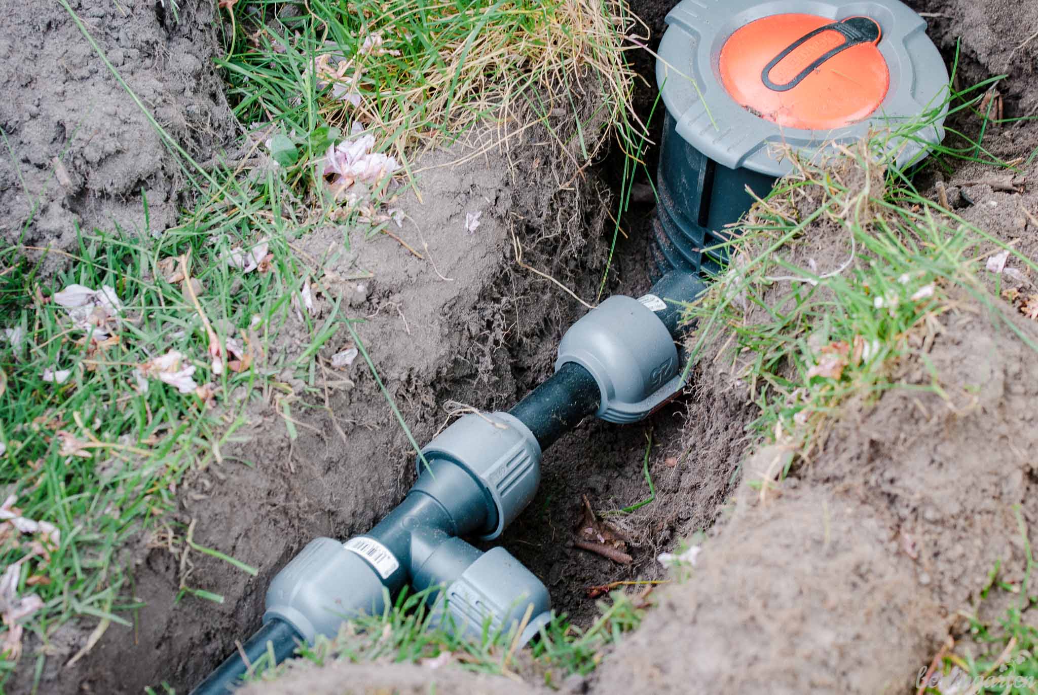Ich gestehe, dass der innere Schweinehund ganz schön jaulte, als wir alle Materialien für das unterirdisch zu verlegende Rasenberegnungssystem sichteten. „Am Ende ist der Rasen schön“ wiederholten wir mantra-artig, um uns selbst zu motivieren. Die ersten Meter abgestochene Rasensode waren hart, aber als die ersten Einheiten verbunden waren, kam Schwung in die Sache. Der Gärtner strahlte: „Das ist ja wie eine Mischung aus Fischertechnik und Playmobil.“ Die Anschlussstücke heißen Quick&Easy-Schnellverbinder und halten, was sie versprechen – tatsächlich ein Spielzeug für Große. Außerdem beflügelte uns der Gedanke, dass sich jede jetzt investierte Minute am Ende in gewonnener Freizeit und Freiheit auszahlen würde.