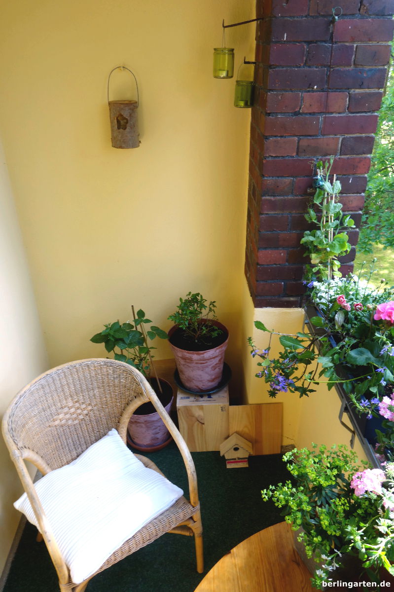 Ein wunderschöner Platz für einen romantischen Abend zu zweit, liebe Xenia. Die Balkonkästen sind sehr schön bepflanzt. Erdbeeren und Salat auf dem Balkon zu züchten, hat den Vorteil, dass die Schnecken den Großstadtverkehr in Berlin wohl nicht überleben und wenn ja, wird es ihnen zu mühsam sein, sich die steile Hauswand bis zum Balkon hochzuschleimen. Ich wünsche viele gemütliche Abende auf Eurem kleinen aber feinen Balkon.