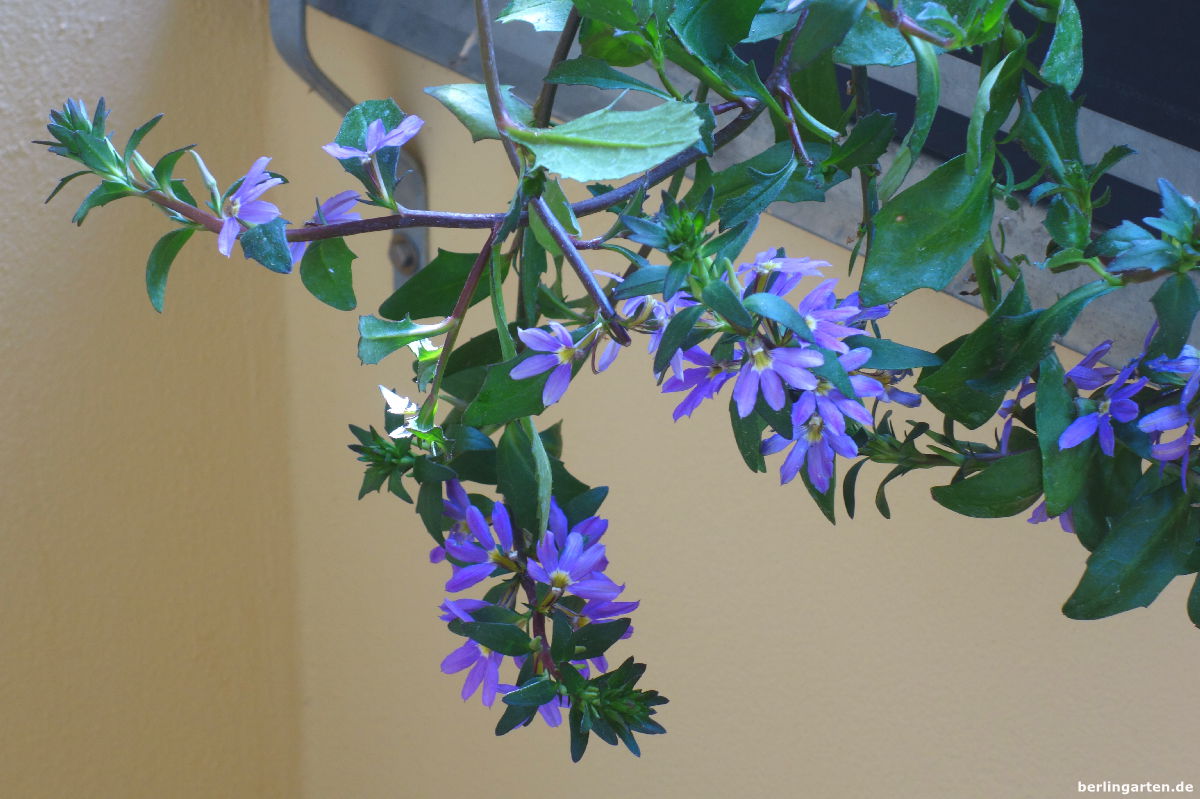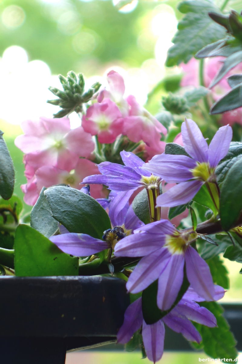 An Rankgewächsen habe ich mich für Männertreu in blau und lila entschieden. Direkt nebeneinander gepflanzt ergeben sie eine richtig schöne Blütenwolke. Eine Lobelie in rosa mit weißem Auge erinnert mich an ein Cornetto Erdbeer, für sie geb ich sogar mein Pferd her. Weiße und lila Fächerblume kann man immer noch schön mit reinschmiegen, die gehen immer und sorgen für einen üppigen Look. Hab ich noch was vergessen? Ach ja, meine Hänge-Erdbeere. Ich bin gespannt, wie sie sich machen wird.