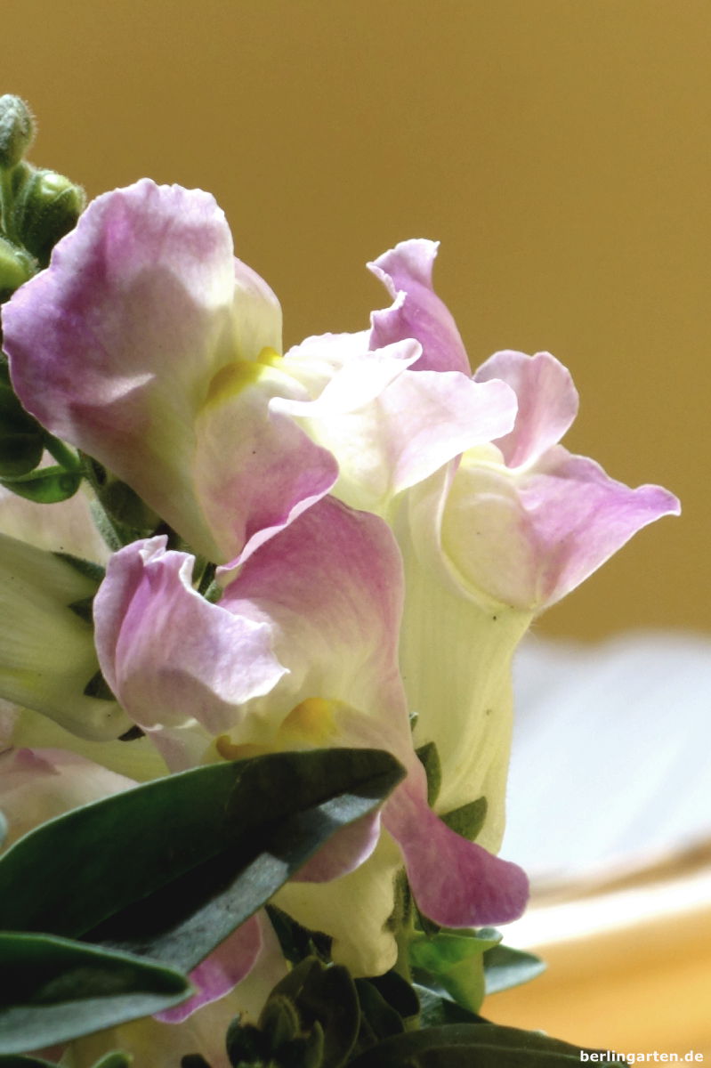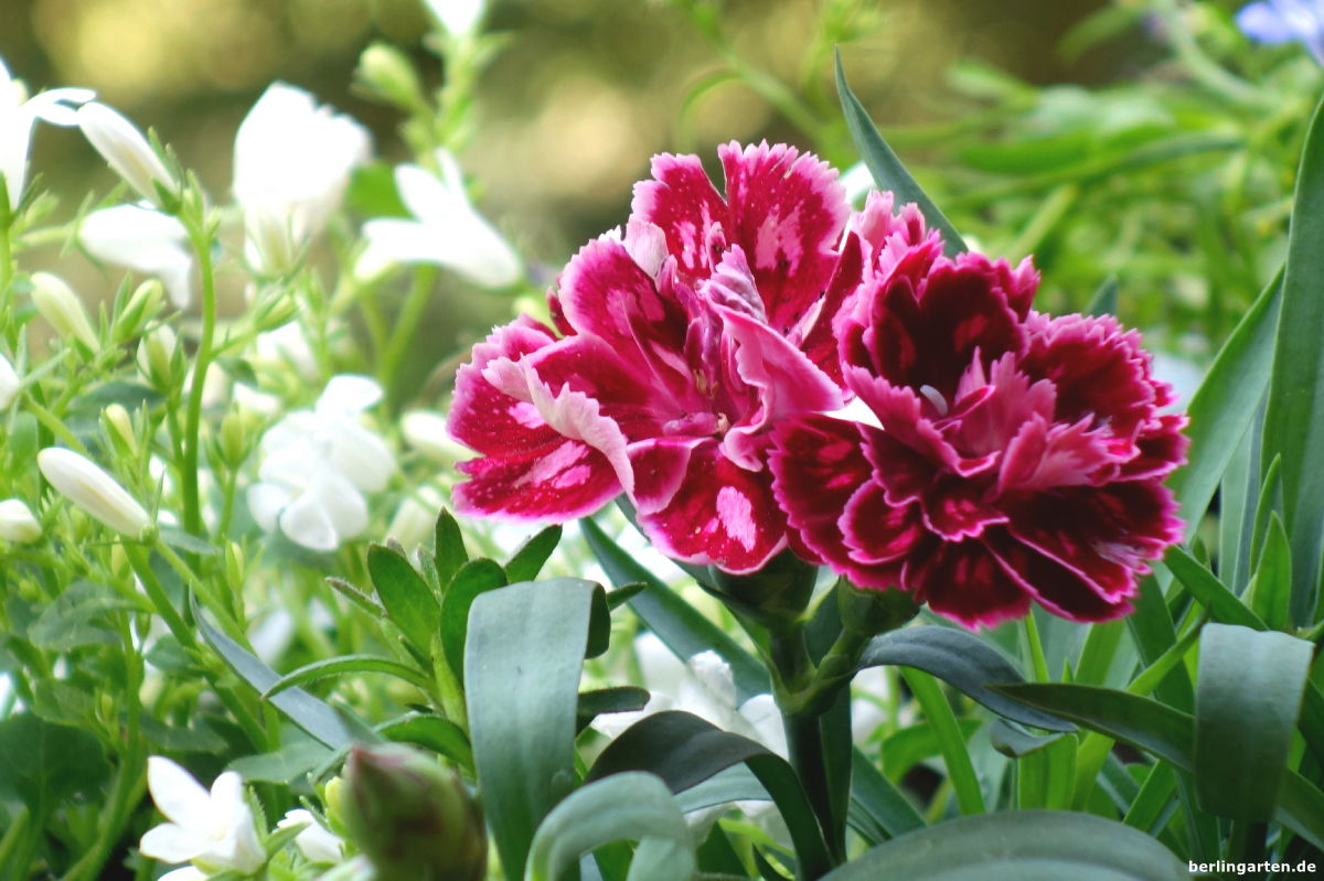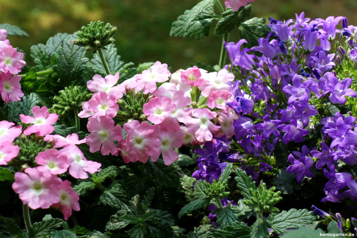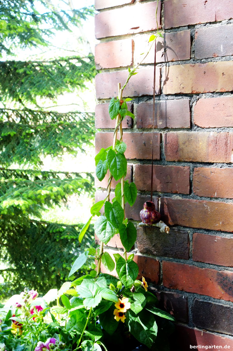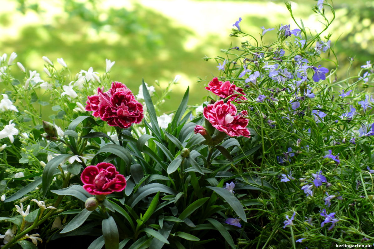 An den Seiten – ich habe eine typische Loggia – sollen Duftwicken und eine lachsfarbene Schwarzäugige Susanne ranken. Dazu haben ich als Rankhilfe Bänder mit Keramikvögelchen aufgehängt, so viel Verspieltheit muss ein. Aufrechte Partner im Kasten sind Geranien in Rosatönen, Nelken mit herrlichem Duft, Löwenmäulchen. Sie sind für die Höhe nötig. Etwas breitere Geschöpfe sind die Glockenblumen in weiß und lila. Sie haben mich schon viele Jahre im Dauerblühtest überzeugt. Wenn ich sie nach dem ersten Flor zurückschneide, sind sie flugs wieder da.