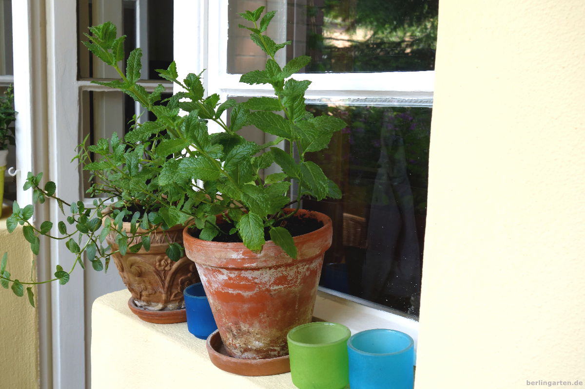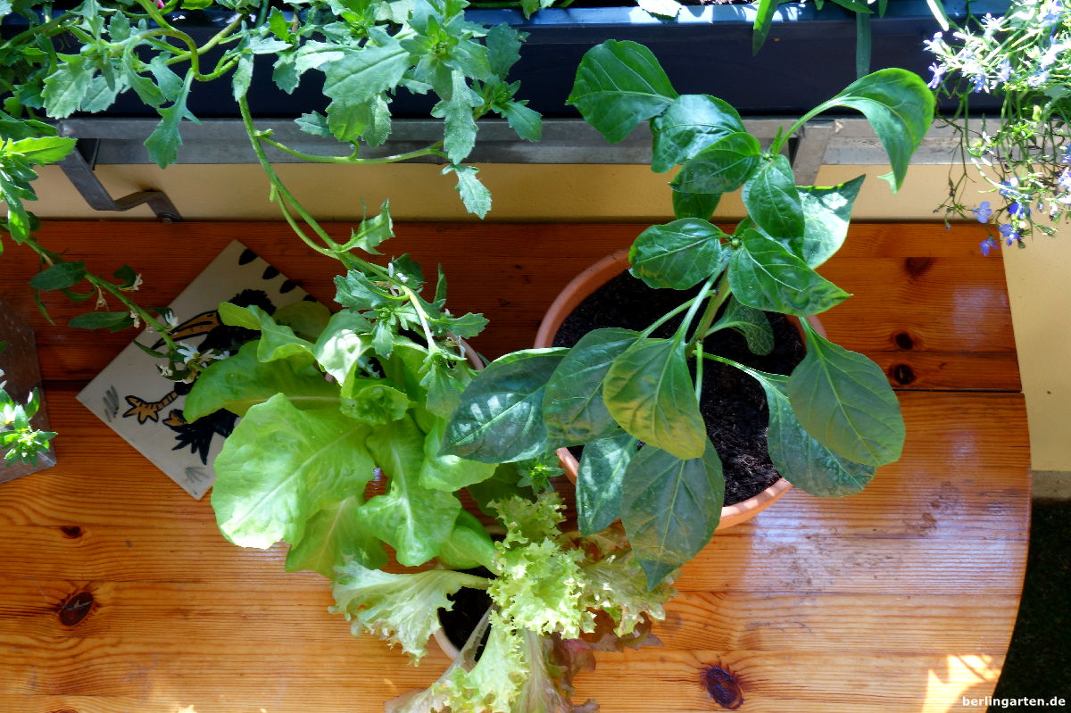 Zu unserem Naschbalkon gehören noch Minzen – schließlich gibt es kaum was Netteres als einen Sommercocktail draußen, oder? Salat baue ich in Einzeltöpfen und überdies in einer flachen Schale an – ein Gemüsebeet en miniature sozusagen. Eine Jalapeno-Pflanze wird Ende des Sommers hoffentlich mit Guacamole & Co. unsere geliebten Tex-Mex-Abendessen aufpeppen. Brom- und Blaubeere der ‚BrazelBerry‘-Kollektion runden unseren Balkon à la Cottagegarden ab.
