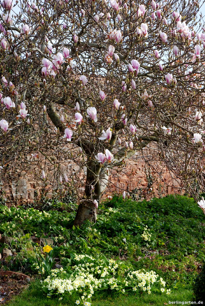 - Die allgegenwärtigen Primeln schmiegen sich an die Magnolie