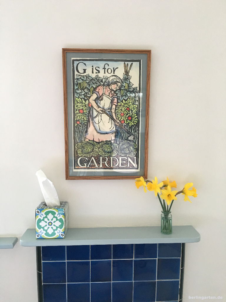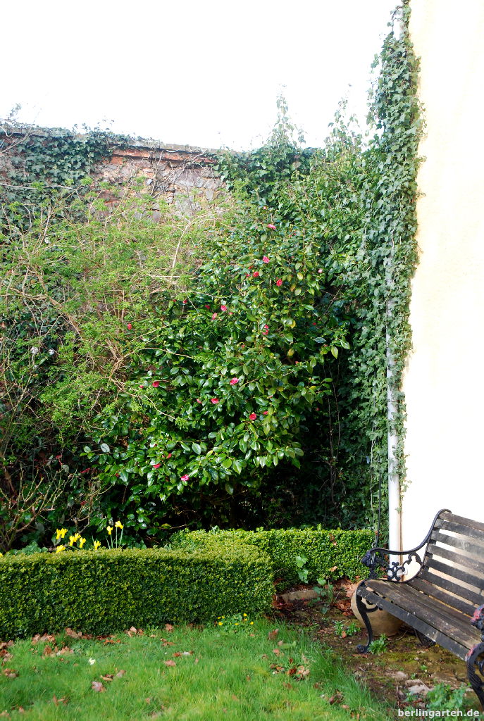 Verliebt habe sie sich damals primär in den Garten, die nach Süden ausgerichtete Fläche, auf der sie sich ihren Gemüsegarten perfekt vorstellen konnte. „I’m good with vegetables, not with flowers.“ Na ja, das würde ich anders sehen. Ihr fliegen die Primeln jedenfalls nur so zu. Die Kamelie steht in voller Blüte, die Narzissen leuchten, die Stauden treiben jetzt Anfang April richtig durch.