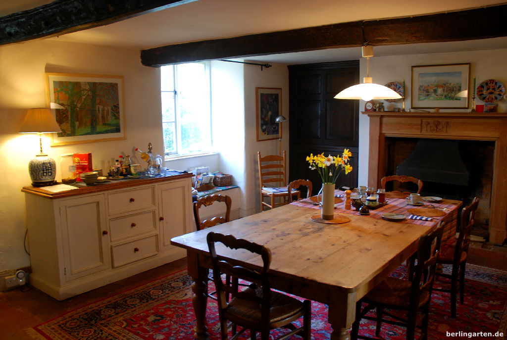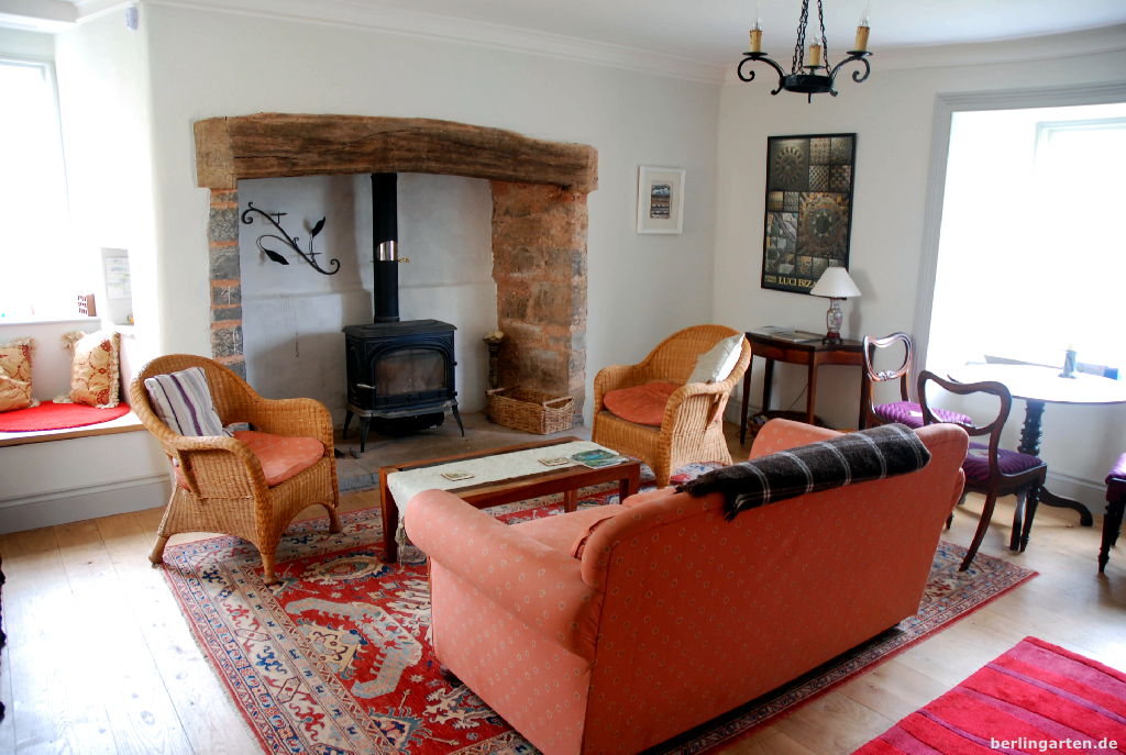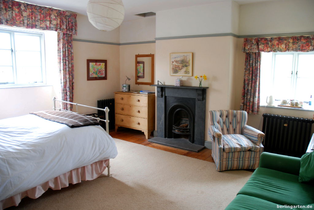 Und was ist nun mit B und mit B? Mit Bed and mit Breakfast? Die Gästezimmer atmen Geschichte wie das ganze Haus. Es wurde im 17. Jahrhundert zur Kirche zugehörig gebaut. Der Vikar lebte hier. Hundert Jahre später wurde ein größeres Vikarshaus errichtet, das Farmhaus verpachtet. Als Suki es vor über 20 Jahren kaufte, war es über die Jahrhunderte völlig heruntergekommen und wurde seitdem Stück für Stück instand gesetzt – der Sitting Room erst vor zwei Jahren, bis dahin war er schlichtweg zugemauert.