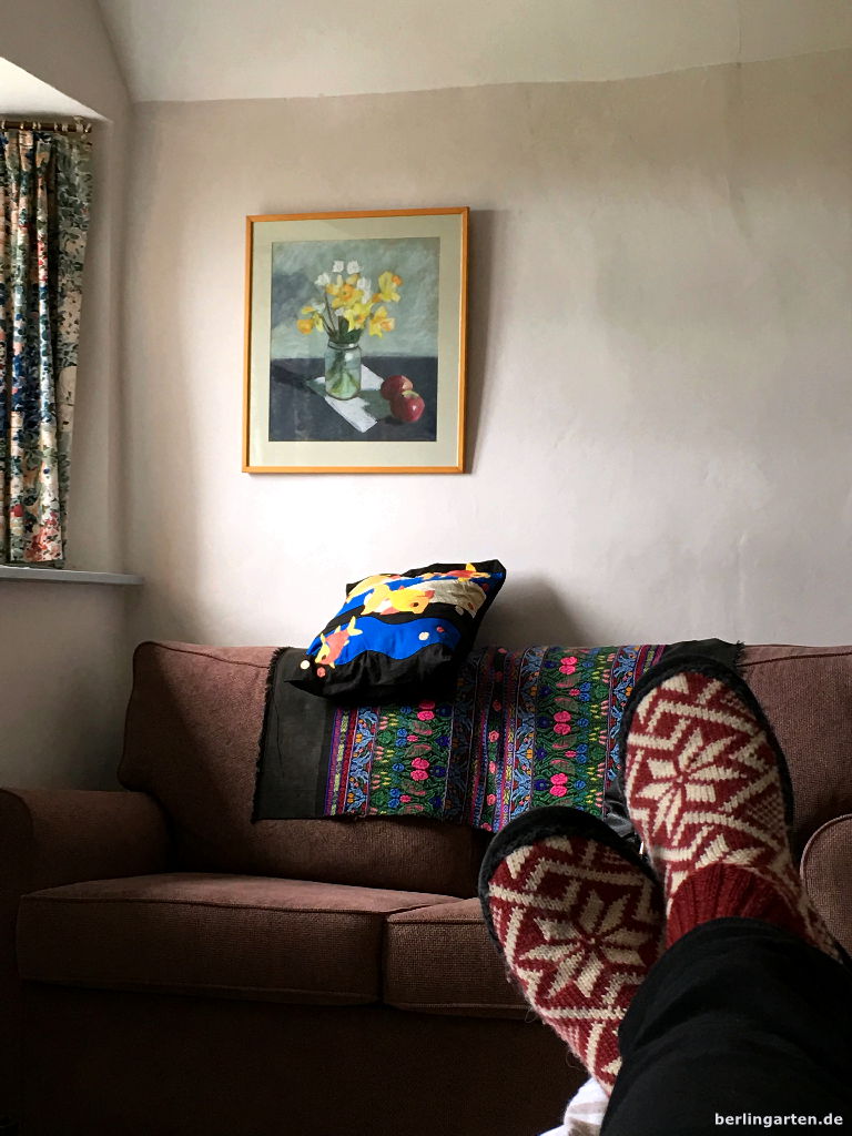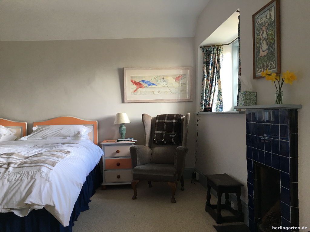 Die drei Bedrooms liegen im Obergeschoss, zwei direkt mit Badezimmer, eines mit Bad über den Flur. Alle so, wie man es sich für ein altes englisches Haus vorstellt. Schlicht, aber geschmackvoll eingerichtet, Kunsthandwerkliches, überall kleine Blumensträuße. Leider war es ziemlich kühl in den Räumen Ende März, Anfang April. Aber bekomm so ein altes Gemäuer mal warm.