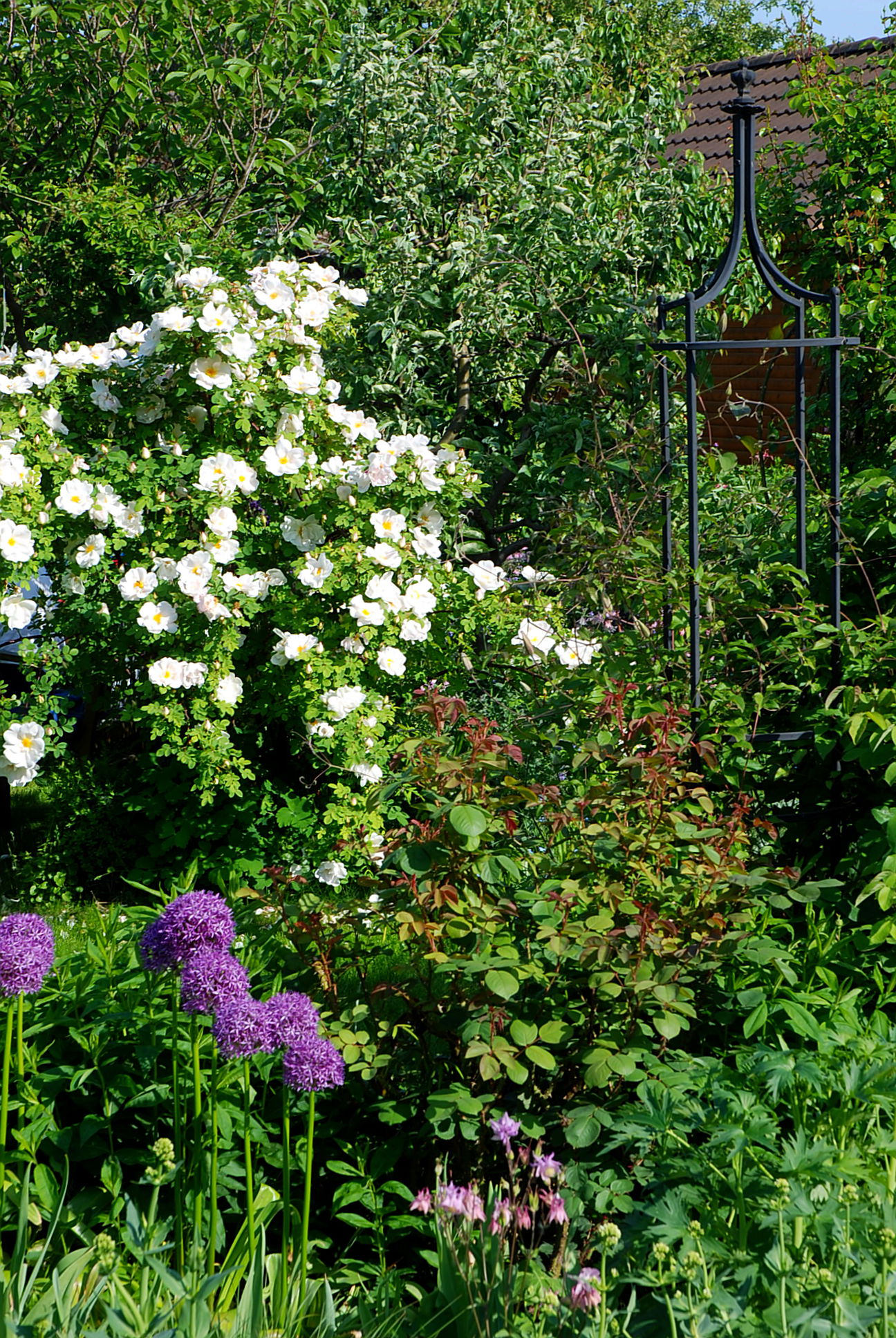 - Parkrose Nevada erblüht, davor Zierlauch und Akeleien