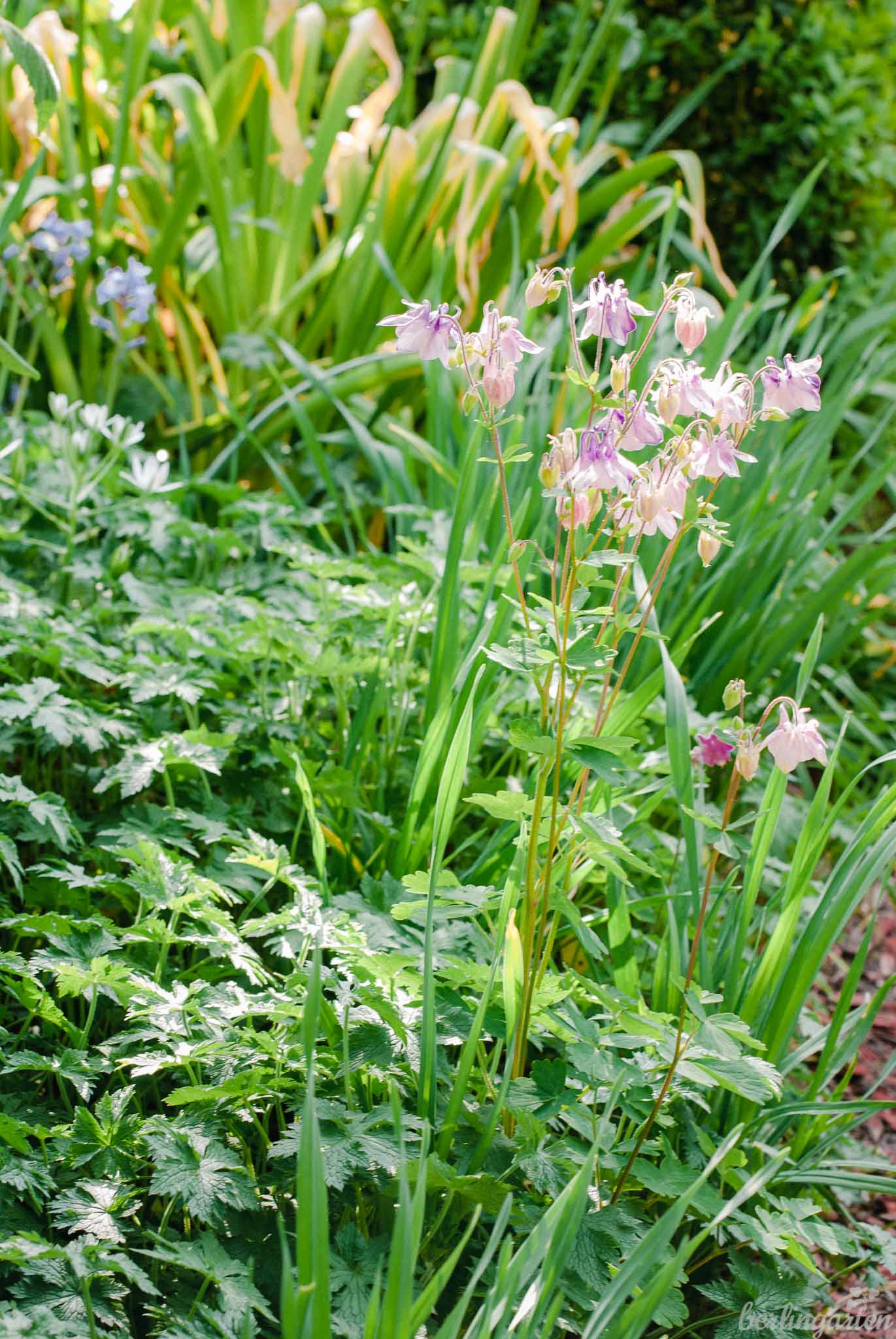 Oder kombiniere die bläulichen Schwerter der Iris zu den pelzigen Tellern des Frauenmantels (Alchemilla mollis), den Eselsöhrchen des Ziest (Stachys – sehr schön siehst du ihn hier auch in Katrins Garten in Uelzen) und den silbernen Nadeln von Lavendel. Lass grasartiges Laub wie das der Taglilien (Hemerocallis) aus einer Manschette von gerüschten und noch dazu buntlaubigen Purpurglöckchen (Heuchera) herauswachsen. Oder sich Farne aus einem Blättermeer von Storchschnäbeln erheben – die Kombinationen sind vielfältig und zeigen mal wieder: Gärtnern ist kreativ!