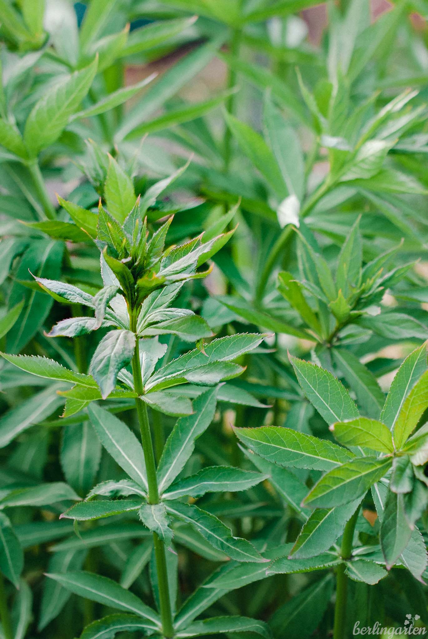 Ich liebe übrigens besonders die palmartigen Blätter der Lenzrosen (Helleborus Hybriden), daher habe ich auch so viele Exemplare davon im Garten. Nachdem die Stauden vom Ende des alten bis weit ins neue Jahr geblüht haben, bilden sie bis in den nächsten Winter hinein einen attraktiven, ja fast exotisch anmutenden Blätterteppich. Unkrautjäten werde ich dort jedenfalls nicht mehr, gießen muss ich ebenfalls weniger, weil das Laub die Erde beschirmt. Was will man mehr von einer Pflanze?