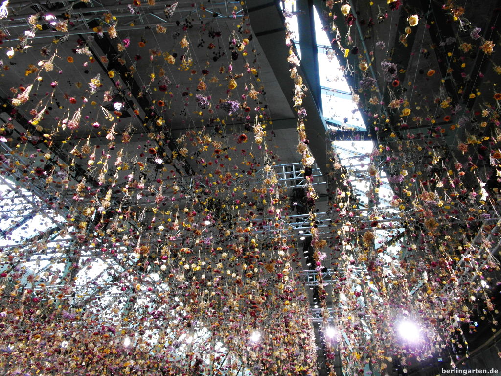 Die Auswahl der Blumensorten für das Kunstwerk zeigt die Vielfalt und Strahlkraft saisonal verfügbarer Schnittblumen und soll künstlerisch eine Verbindung zwischen Mensch und Natur schaffen. So treffen im „Garten“ Gerberas und Alstroemerien in rot und orange auf Hortensien und Lisianthus in zartrosa. Tausende Rosen, Freesien, Orchideen und Chrysanthemen vollenden die florale Installation. Der Eindruck ist hell, luftig, heiter. Ein Wermutstropfen ist die unschöne Spotbeleuchtung. Ein gescheites Foto mitzubringen war ganz schön schwer.