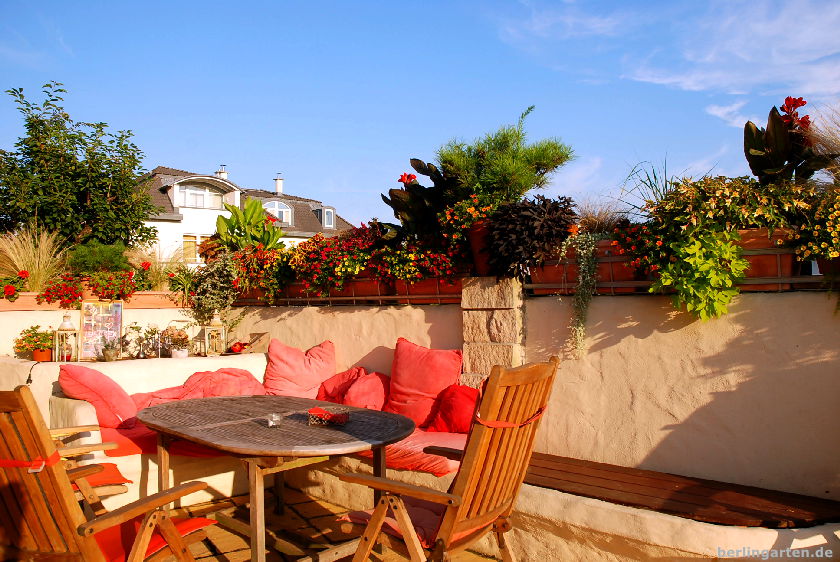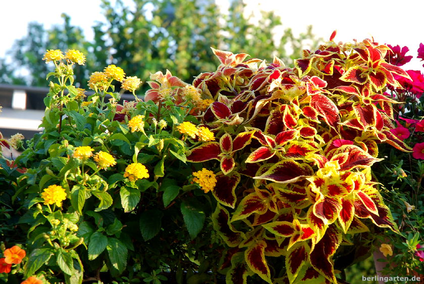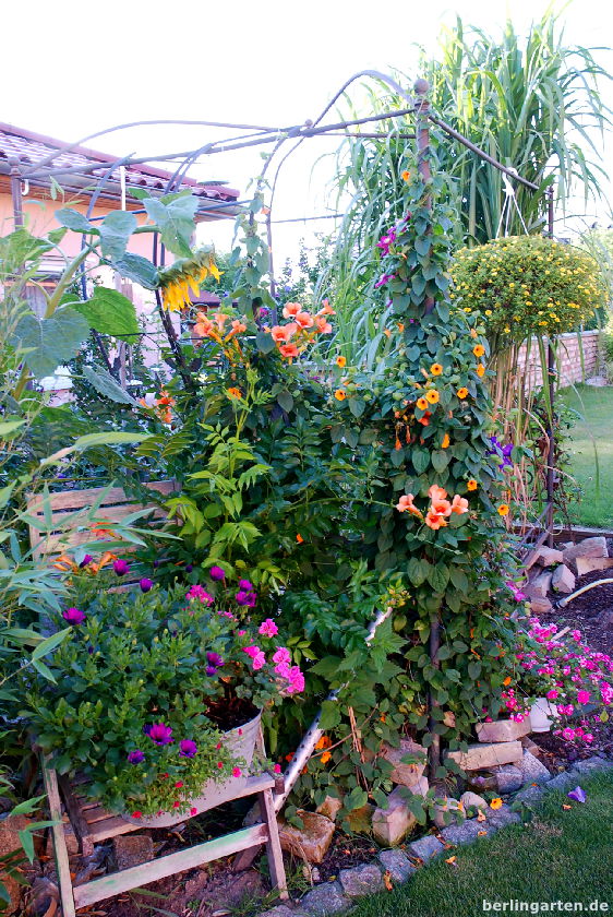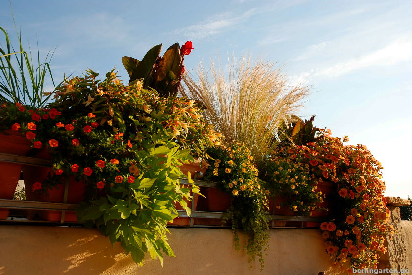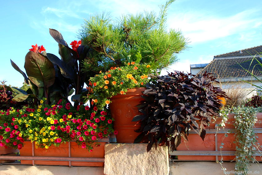Bleibt die Frage nach dem Wassebedarf. Da sind wir beim Fleiß: Britta steht im Sommer um 5:30 Uhr auf und gießt je nach Hitze zwischen einer halben und anderthalb Stunden. Abends kommen nochmal anderthalb Stunden dazu, jetzt im August ab und zu mit Flüssigvolldünger versetzt (8+8+8, enthält alle Hauptnährstoffe). Der sorgt für üppiges Blattwerk und Blütenflor. Was verblüht ist und nicht von allein abfällt, wird abgeschnitten; konsequent. Nur so produzieren die Pflanzen laufend neue Blüten.