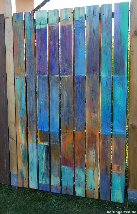Praktisch und schön ist das Fahrrad-Versteck. Es gab in letzter Zeit einen wahren Hype um kreative Ideen um Europaletten. Hier geben die hölzernen Tausendsassa eine Vorstellung als Kaschierung des Fahrradständers. Künstlerisch bemalt sind sie eine echte Augenweide.