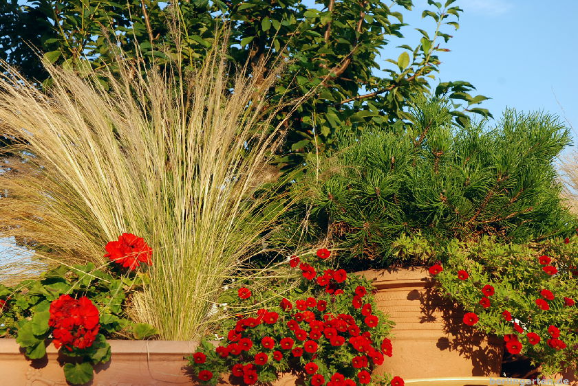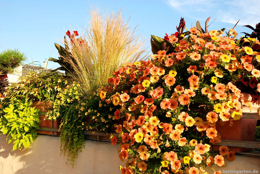 Bei der Auswahl der Pflanzen schwört Britta auf die Minipetunien (Zauberglöckchen Calibrachoa), sie sich selbst putzen und an sonnigen Standorten üppig blühen. Dazu kombiniert sie Strukturpflanzen wie Gräser, kleine Koniferen oder Blattschmuckbegonien.