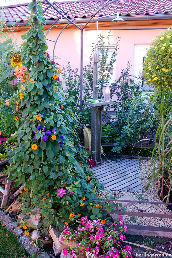 Typisch für ein Draußen-Kind ist eine Draußen-Dusche. Wenn es warm und sommerlich ist, bietet ein altes metallenes Bettgestellt den würdigen Rahmen für eine Outdoor-Erfrischung. Privatheit stellen Rankpflanzen her (na ja, halbwegs wenigstens). Sie akzeptieren das Gestell, als wäre es ein Baum im Dschungel. Angesichts der Hitze bei unserem Besuch war ich glatt ein bißchen neidisch bei dieser Vorstellung morgendlicher Erfrischung.