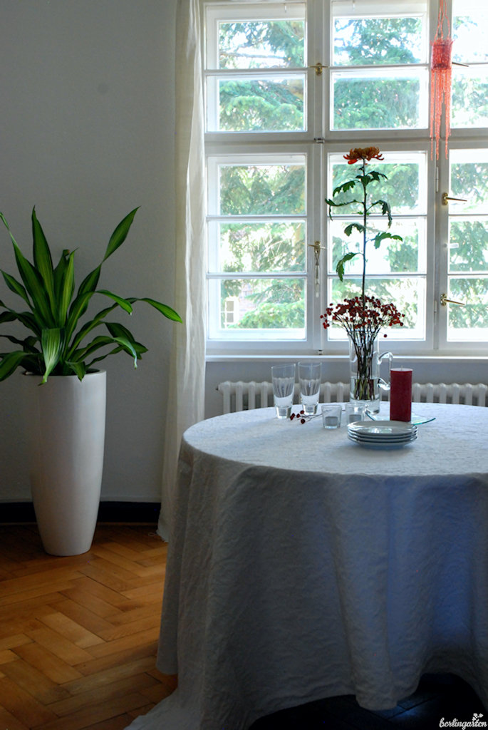 - Unser Esszimmer mit Chrysanthemenschmuck. Das hohe, aufstrebende Arrangement passt zu unseren hohen Räumen.