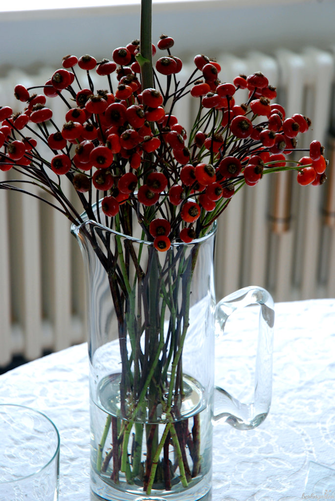 - Nach drei Wochen leben Chrysantheme und Hagebutten kürzer geschnitten in einer länglichen Vase weiter