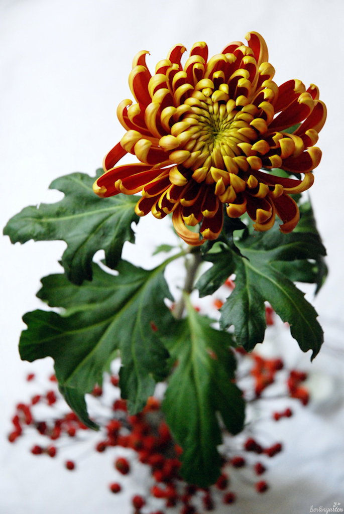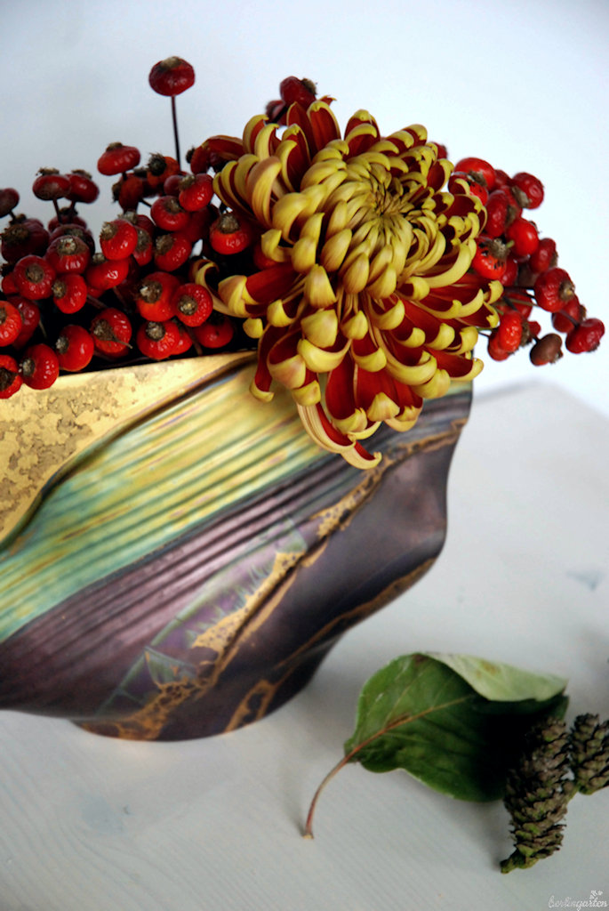 „Ein Herz für Igel“ könnte auch überschrieben sein, wie ich es hinbekommen habe, dass die Chrysantheme kerzengerade in der Mitte des Kruges steht. Seit ich Ikebana mache, verwende ich fast für alle Sträuße die geheimen Helfer mit den langen Stacheln. Im Japanischen heißen sie Kenzan. Sie sind so schwer, dass sie selbst kräftigen Pflanzen sicheren Halt geben. Mit dem Steckigel im Krug war also alles gesichert. Aufgefüllt habe ich am Ende mit Hagebutten, die den Kenzan verdecken und aus denen die Chrysantheme herauszuwachsen scheint. Fertig ist die Blütenfreude für mindestens drei Wochen.
