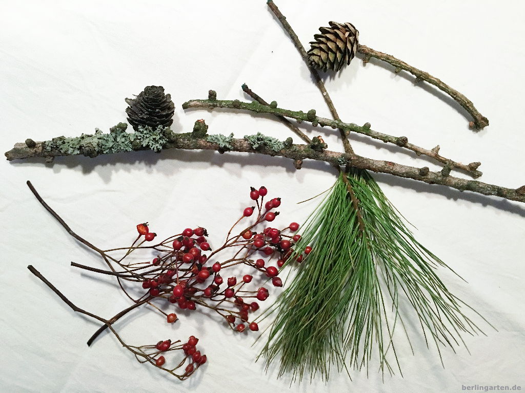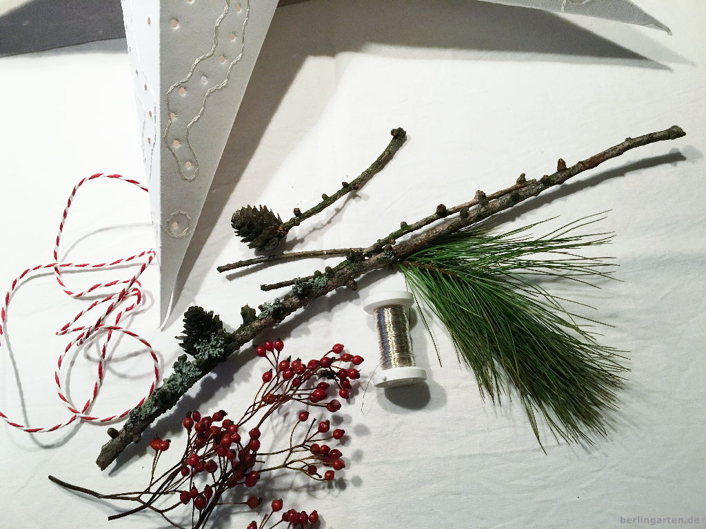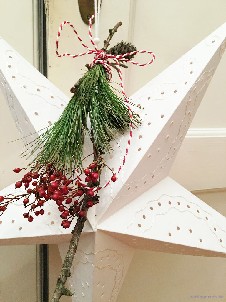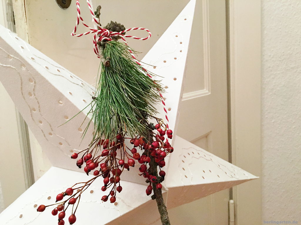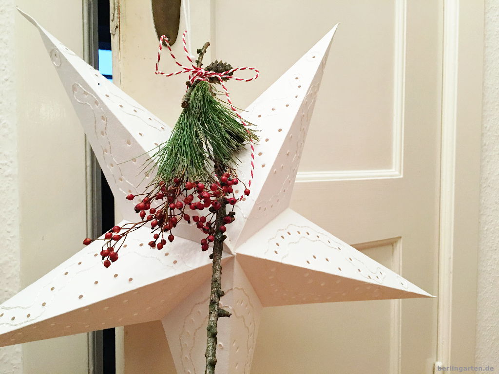 Der Stern ist eine Ruck-zuck-Idee statt des klassischen Türkranzes oder auch schön als Fensterschmuck. Die Papiersterne gibt es inzwischen ja überall und ein paar Accessoires aus dem Garten passen immer gut, oder?